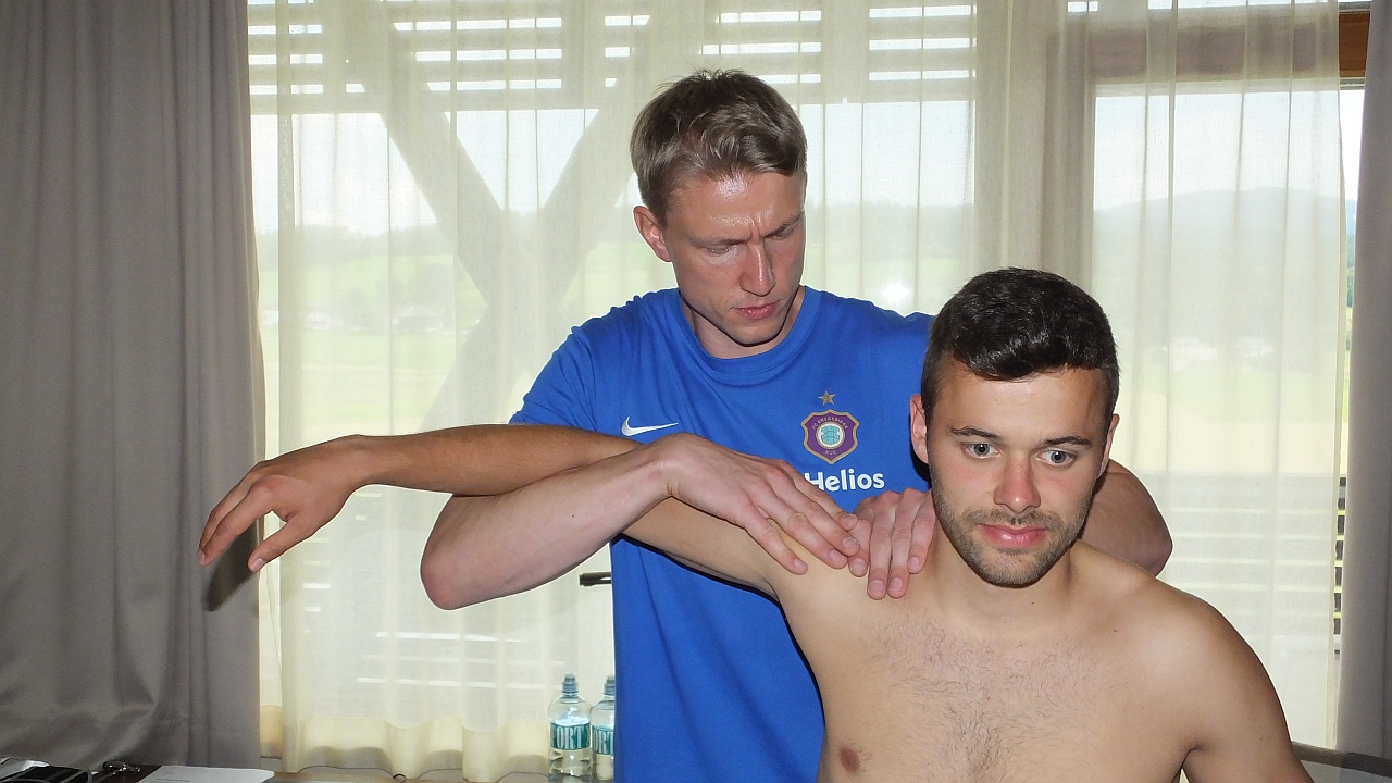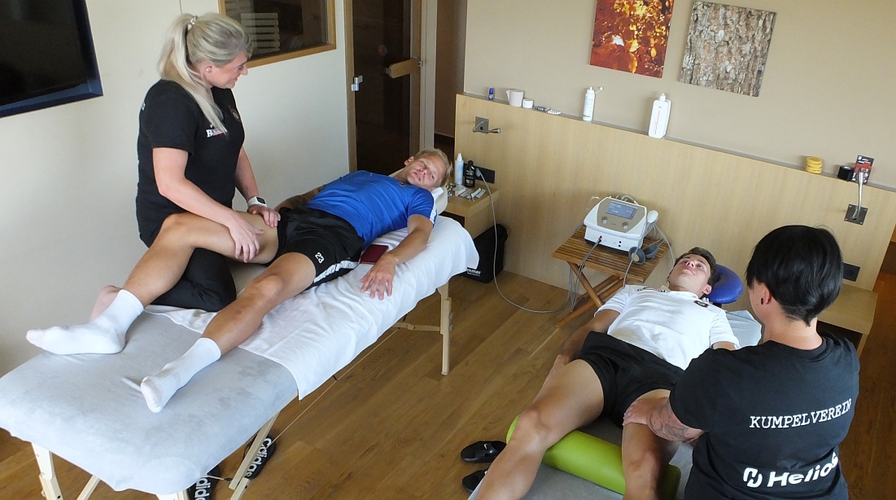 Hochbetrieb auch bei unseren zwei Physios Nadine und Marie. Nadine kümmert sich hier gerade um Sören Bertram. Clemens Fandrich ist bei Marie in Behandlung.