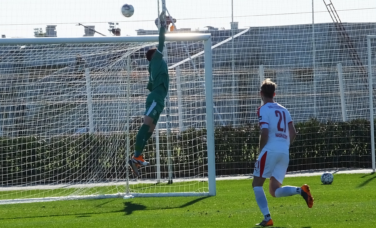 Hier kann Halles Keeper Kai Eisele den Ball noch übers Tor lenken. Nach dem Seitenwechsel ist er gegen den Kopfball von Pascal Testroet (50. Minute) machtlos - die Veilchen gewinnen die Partie gegen den Drittligisten aus Halle mit 1:0. Rund 150 in die Türkei mitgereiste FCE-Fans und Sponsoren waren dabei.