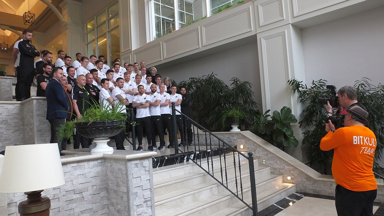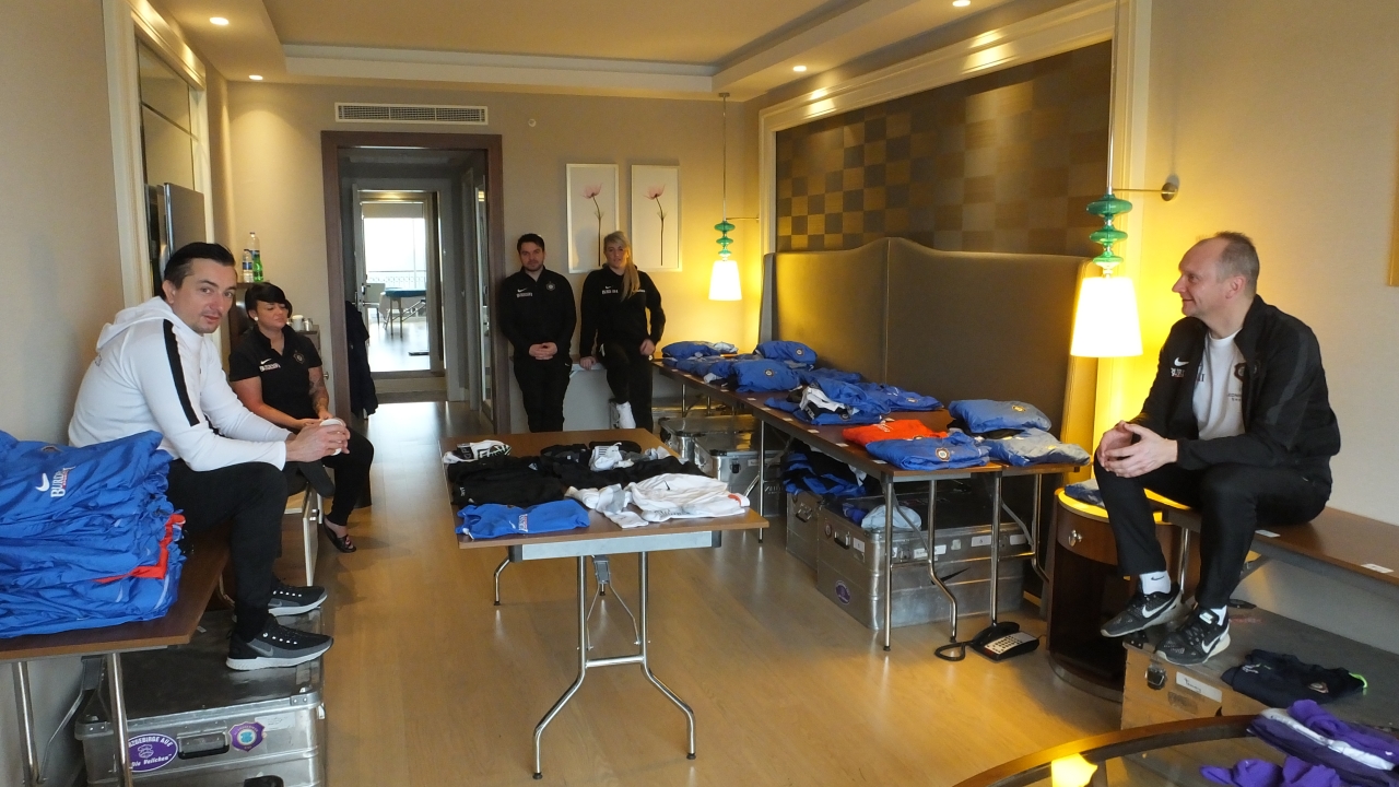Und im Ausrüstungszimmer unterhält sich unser Chefcoach Daniel Meyer mit dem Funktions- und Physioteam. Vor dem Mittagessen das vorzeitige Erinnerungsfoto für die uns begleitende