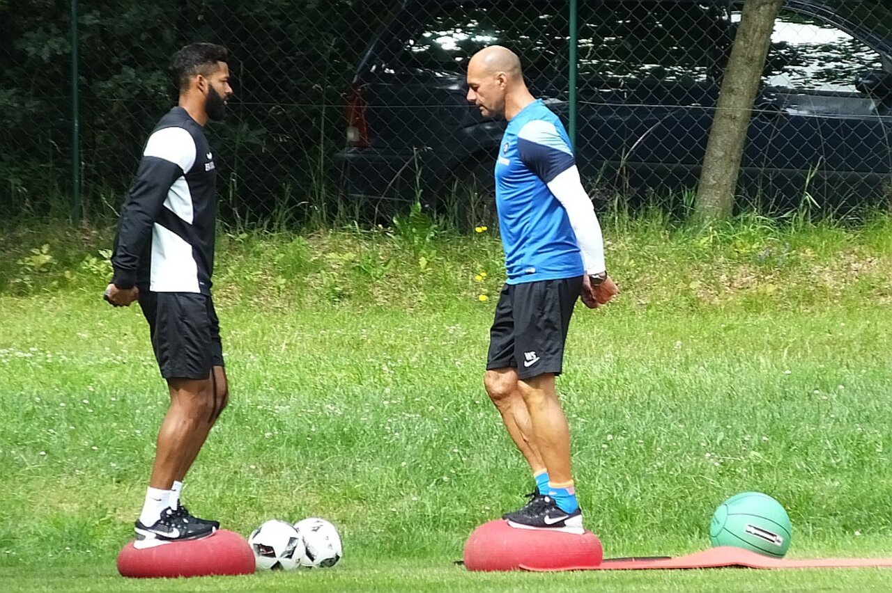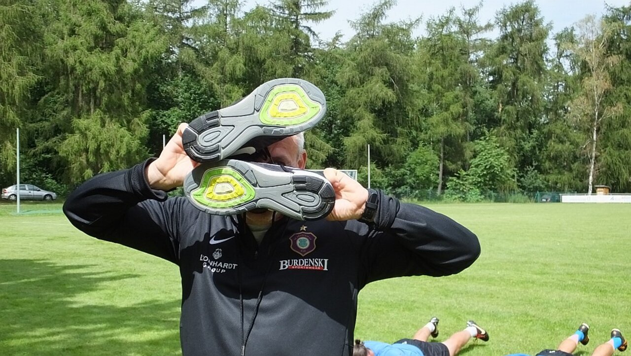 Insgesamt war unser Chefcoach Pavel Dotchev mit der Trainingseinheit sehr zufrieden, will er uns hier wohl hinter vorgehaltenen Schuhen zuflüstern.