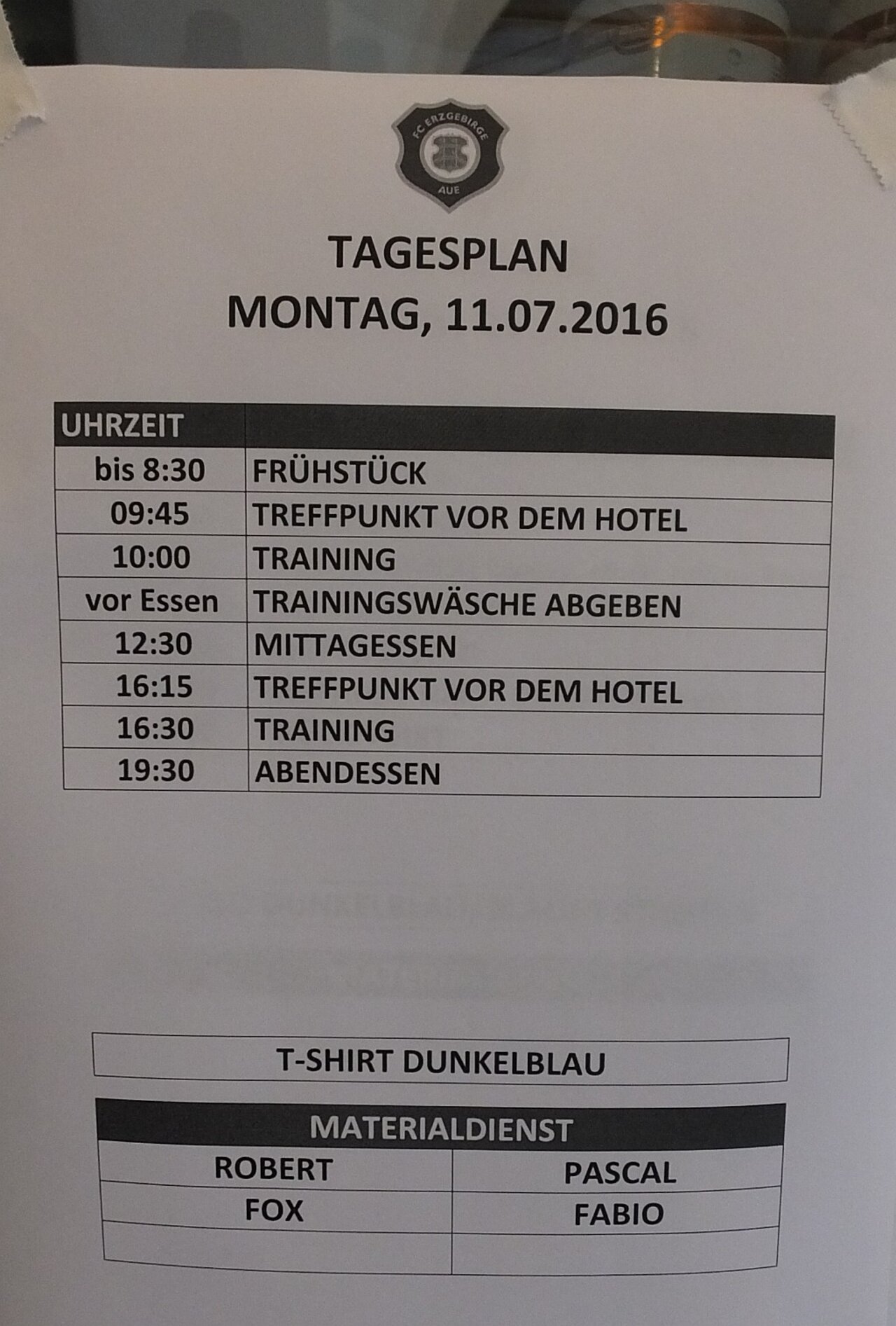 Unser letzter kompletter Tag im Veilchen-Camp Höckendorf 2016, denn morgen steht nach dem Training am Vormittag ja das Einpacken und die Abreise zum Testspiel in Gelenau auf dem Programm. Hier also unsere heutige 'Tagesordnung':