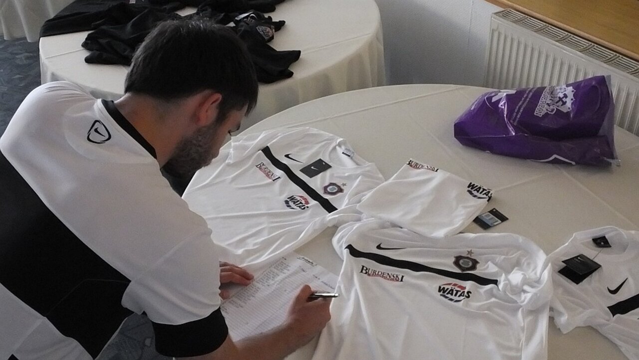 Hier probieren Björn Kluft und Dimitrij Nazarov die neuen Trainings-Shirts an. Größe S, M, L oder XL? Alles wird pro Spieler genau anprobiert und notiert.