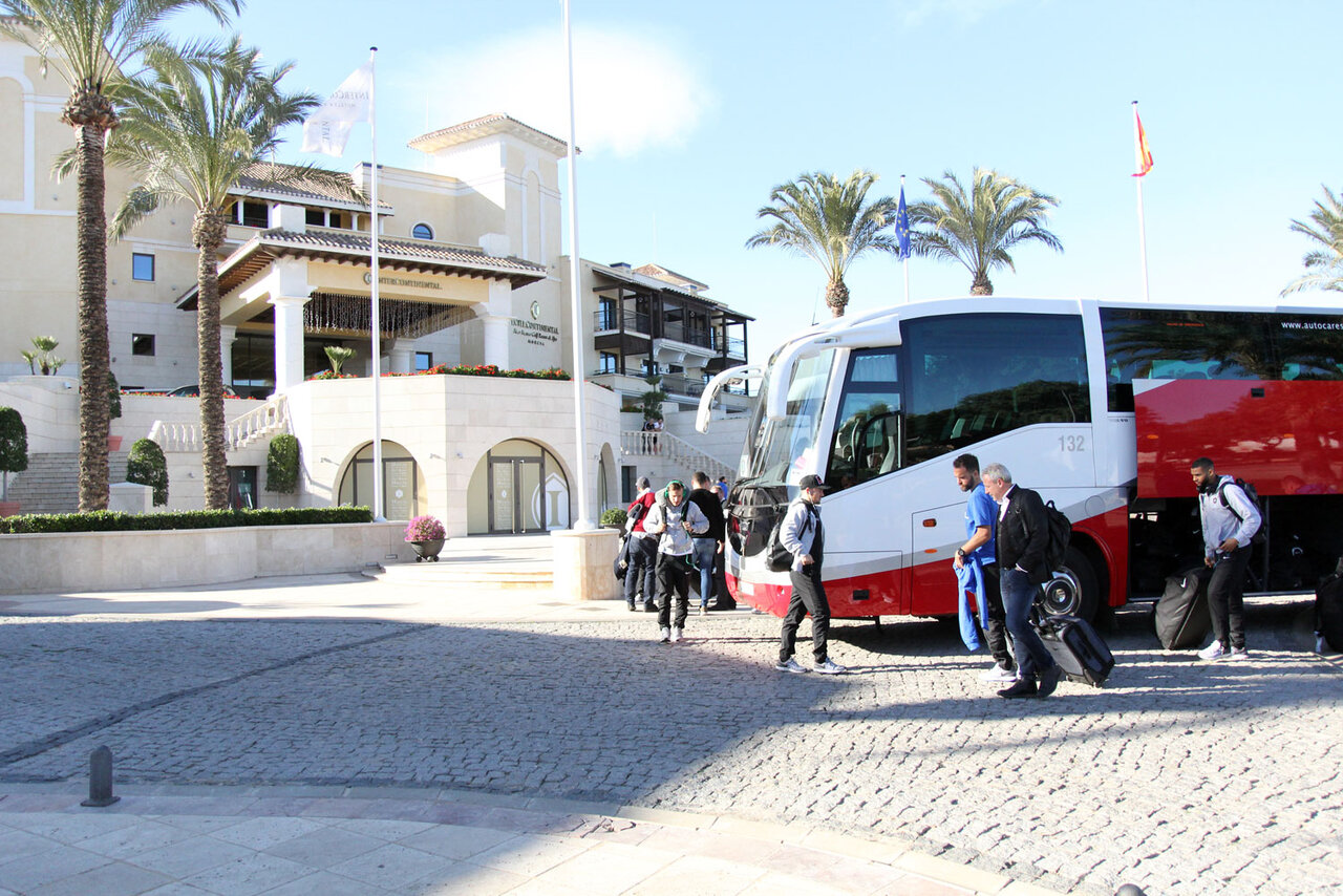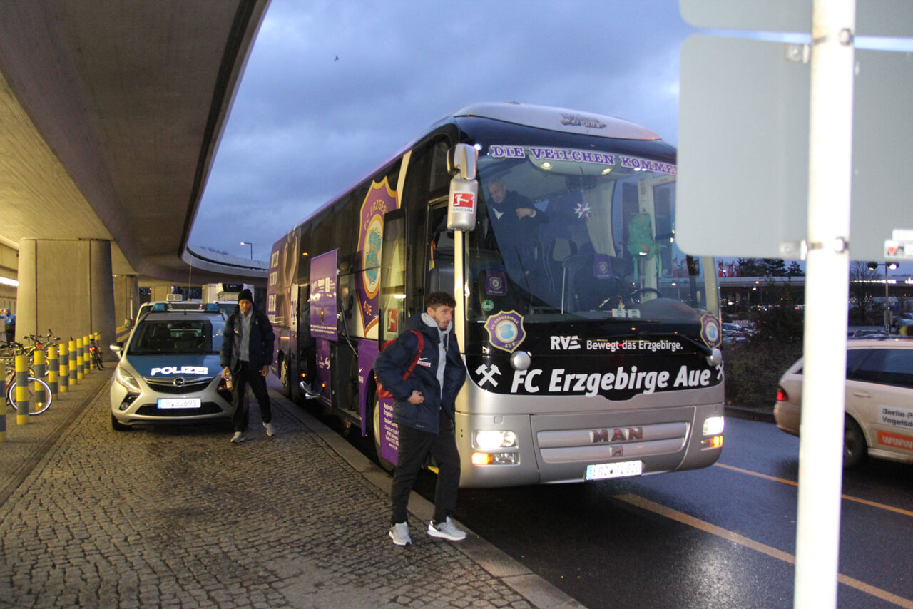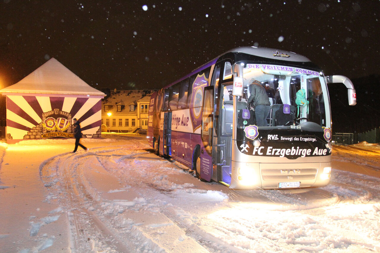 Schon vor 04:00 Uhr stand heute früh der Veilchen-Mannschaftsbus vor der eingeschneiten FCE-Geschäftstelle. Trotz der widrigen Bedingungen waren alle pünktlich und wir konnten 4:45 Uhr Richtung Flughafen Berlin Tegel starten.