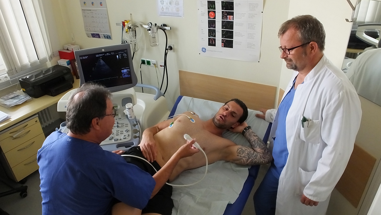 Nach einer kurzen Einweisung ging es dann auch schon zur Sache, Messung des Blutdrucks und Blutabnahme waren rasch erledigt. Anschließend weiter in die Funktionsabteilung. Hier ist Daniel Haas schon zur Echokardiographie (Herzecho) bei Oberarzt Heinz Jacob (li.).