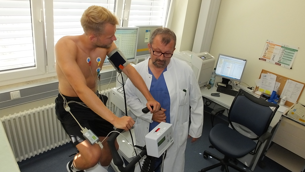 Ein paar Zimmer weiter 'strampelt' Pascal Köpke fleißig auf dem Fahrradergometer. Teamarzt Seltmann überwacht alles,