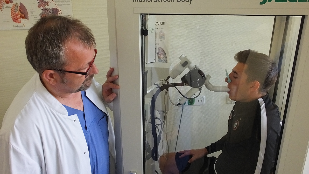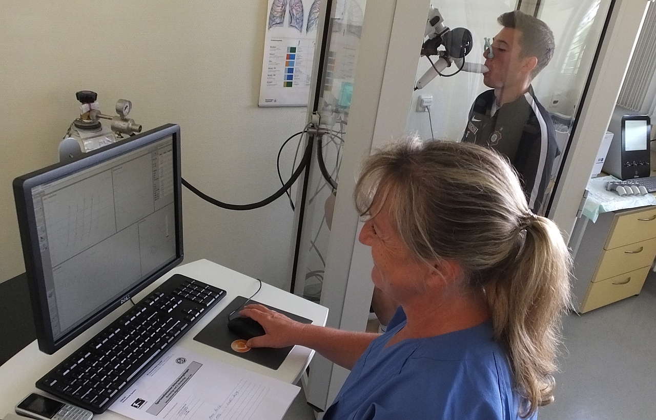 Schwester Reni Sothen, Leiterin der Funktionsabteilung, bescheinigt Mario Kvesic prima Werte beim Lungenfunktionstest.