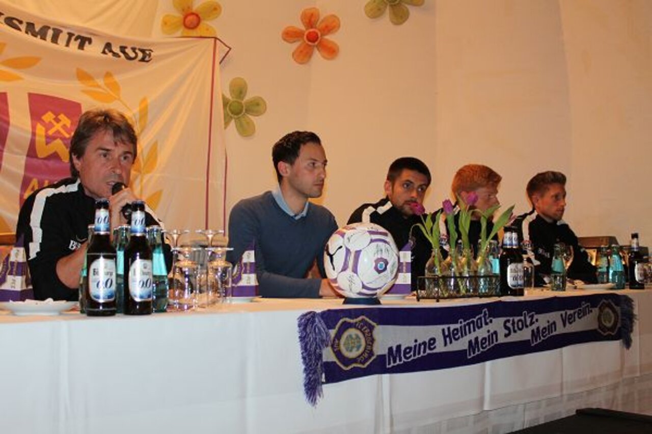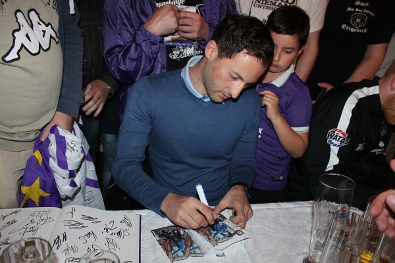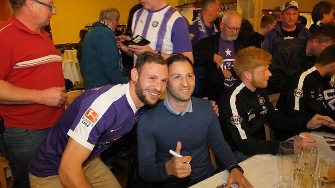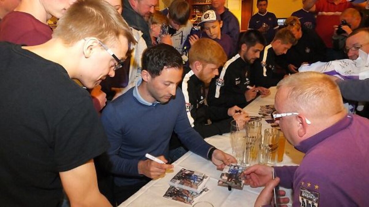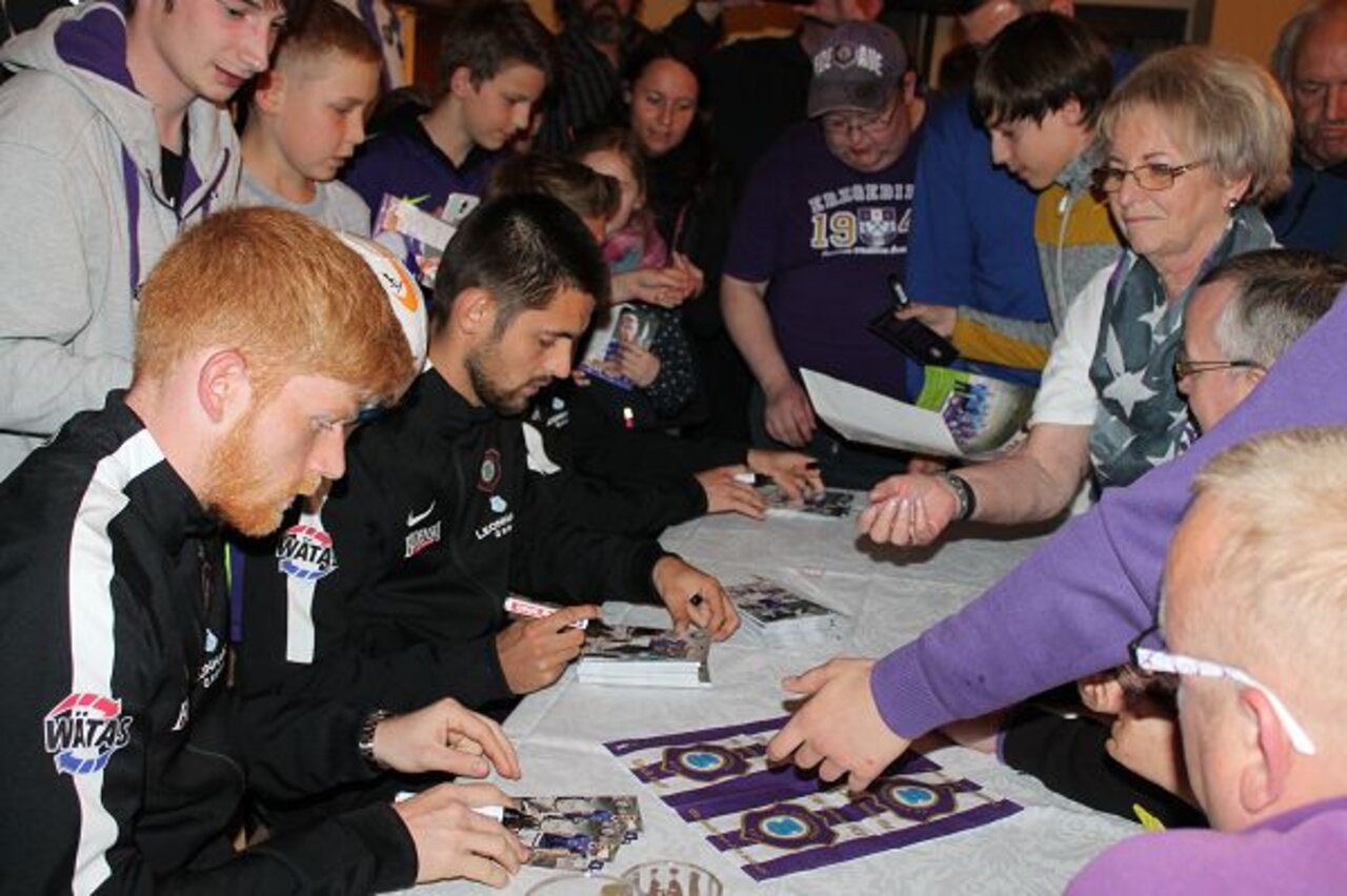 Mehr als 120 Veilchenfans fanden gestern den Weg in den "Schwarzen Bären" nach Zöblitz bei Marienberg. Die Veilchen hatten sich angesagt und und die Fans waren in Scharen gekommen um unseren Cheftrainer Domenico Tedesco und unsere Kicker Fabian Kalig, Sebastian Hertner und Dimitrij Nazarov zu sehen und ihnen ihre Fragen zu stellen. Mehr als eine Stunde wurden die unzähligen Fragen der Fans beantwortet. Man schwor sich gemeinsam auf die 6 bevorstehenden Endspiele ein. Sehr begehrt waren im Anschluss natürlich die Autogramme und die Erinnerungsfotos.