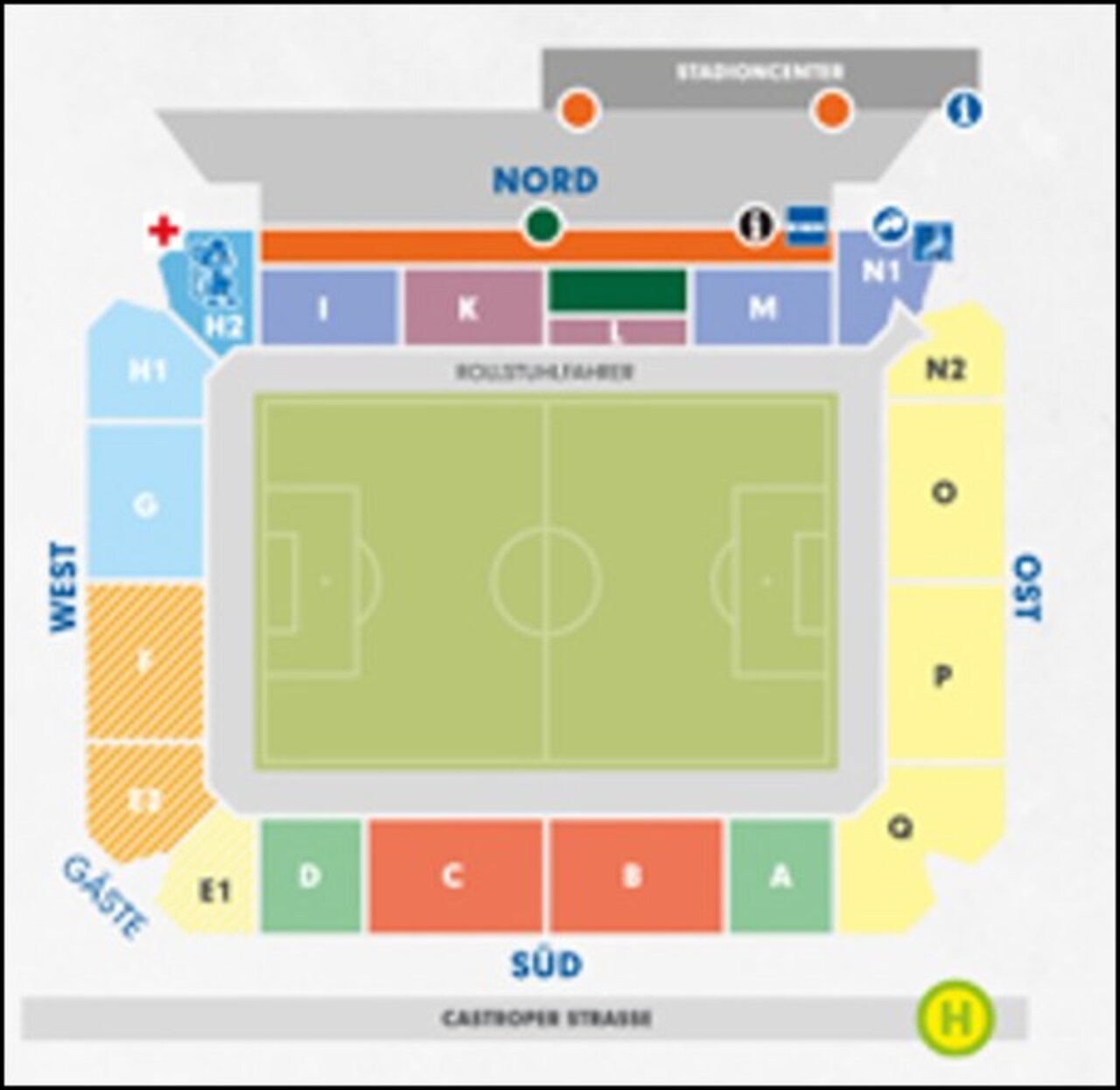 Der Gästebereich befindet sich auf der Westtribüne in den Blöcken E1 (Stehplätze) und E2 & F (Sitzplätze).