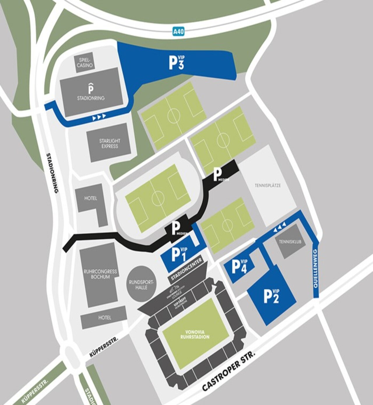 Von der A40 die Ausfahrt Stadion benutzen und direkt an der Ausfahrt links in das Parkhaus „Stadionring“ fahren, das exklusiv für Gästefans zur Verfügung steht. Die Parkkosten für Pkw betragen 5 Euro.