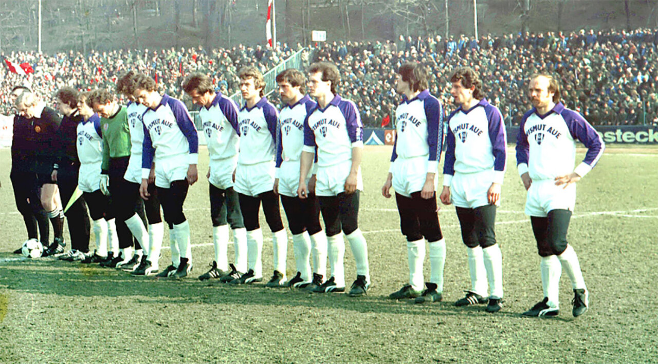 Die Auer Wismut-Mannschaft vor Beginn des Oberligaspiels am 27. Februar 1982 im Otto-Grotewohl-Stadion, von rechts: Frank Stein, Erhard Süß, Ralf Kraft, Jürgen Köberlein, Harald Mothes, Holger Erler, Thomas Teubner, Wolfgang Körner, Volker Schmidt, Torwart Ulrich Ebert und Jürgen Escher. Die Begegnung endete 1:1. Foto: Frank Kruczynski