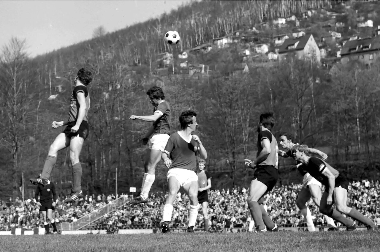 Szene aus dem Oberligaspiel zwischen der BSG Wismut Aue und der BSG Stahl Riesa am 11. April 1981, das die Lila-Weißen zu Hause mit 2:3 verloren. Im Bild steigt Erhard Süß zum Kopfball hoch; vorn steht Thomas Teubner, hinten rechts Wolfgang Körner. Foto: Frank Kruczynski