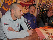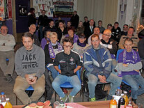 Gut 40 Veilchenfans kamen am Montagabend zum Weihnachtsstammtisch ins Fanprojekt Aue. Die Gäste vom FCE, Cheftrainer Hannes Drews und Fußballprofi Christian Tiffert, beleuchteten nicht nur sportliche Hintergründe, sondern verrieten auch so manche Anekdote. Zum Beispiel, dass Domenico Tedesco auf Schalke bei jeder TV-Übertragung eines Aue-Spiel mitfiebert und -zittert. Ihr Gastpräsent, ein Veilchen-Weihnachtsfensterbild, bekam gleich einen Ehrenplatz im Fanprojekt. Übrigens, die Fensterbilder gibt’s auch zu kaufen, und zwar im