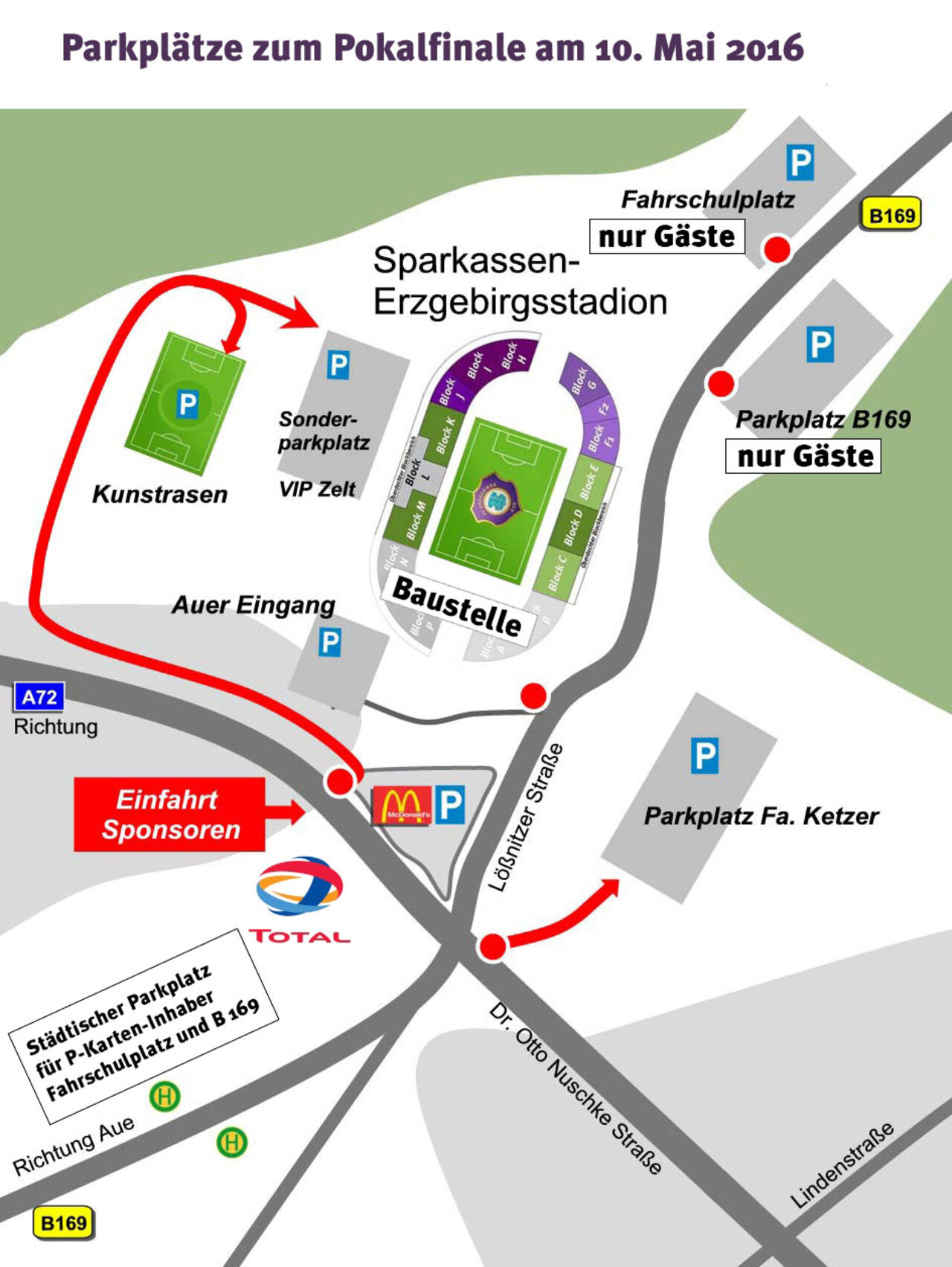 - die Parkplätze ‚Fahrschulplatz‘, ‚B 169‘ und Gaststätte ‚Los Krachos‘ (B 169 zwischen Lößnitz und Aue) sind zum Pokalfinale ausschließlich für Gästeanhänger reserviert