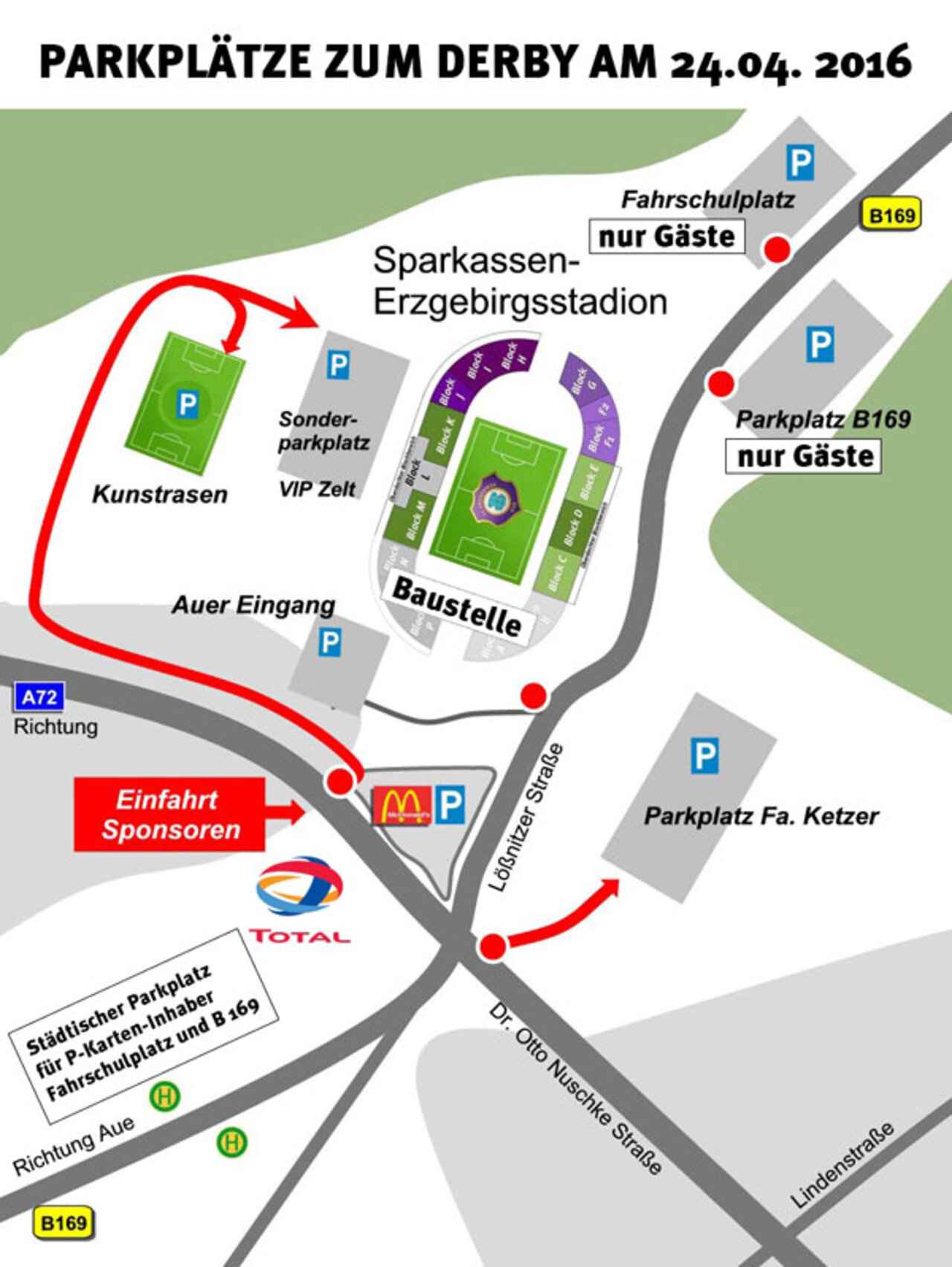 - Inhaber von FCE-Parkkarten ‚Fahrschulplatz‘ und ‚B169‘ nutzen zum Derby den städtischen Parkplatz an der B 169 oberhalb der TOTAL-Tankstelle; für P-Karten-Inhaber gebührenfrei