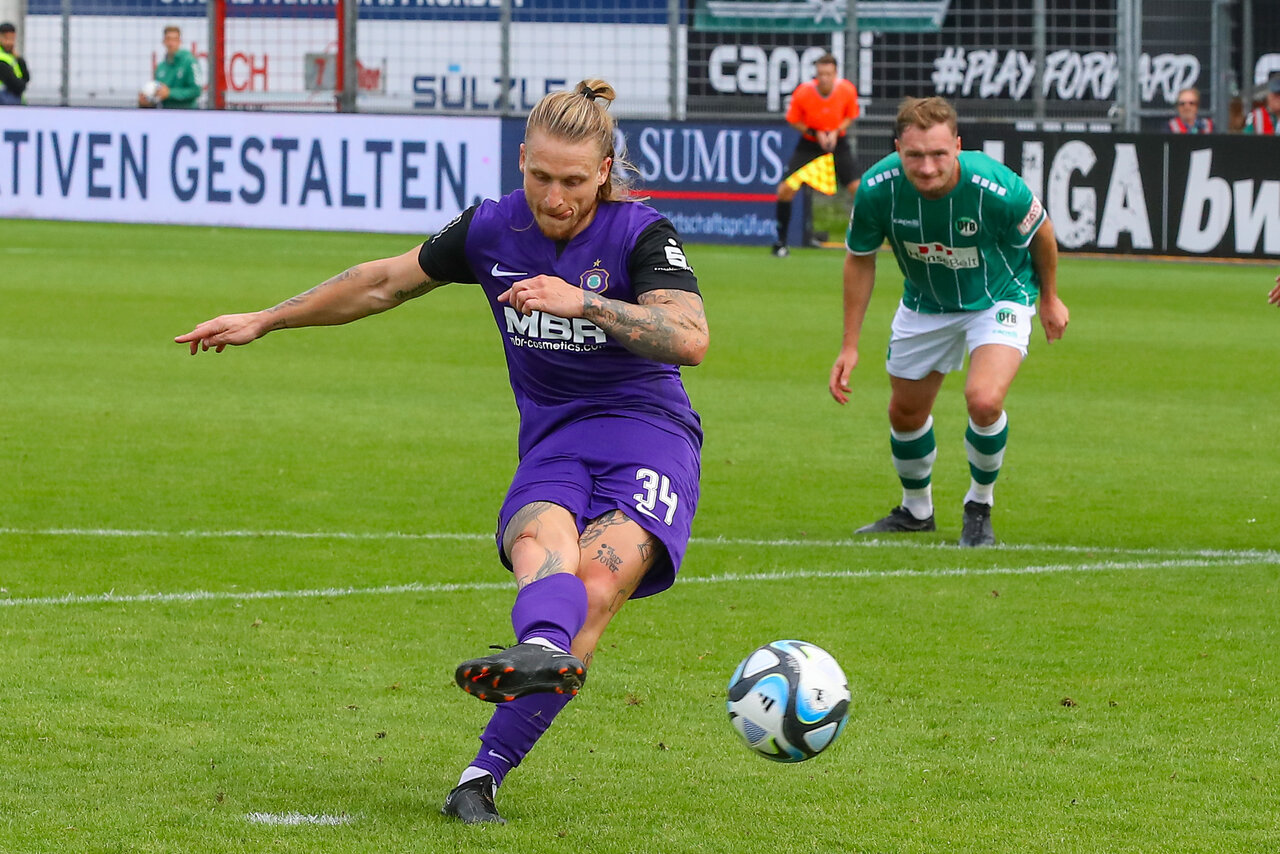 Pavel Dotchev reagierte erneut und brachte mit Marcel Bär und Boris Tashchy zwei weitere Stürmer auf das Feld. Torraumszenen gab es weiterhin nur wenige und etwas aus dem Nichts zeigte in der 71. Minute Schiedsrichter Bartnitzki auf den Punkt im Lübecker Strafraum. Was war passiert? Barylla schlug einen langen Ball auf Bär, der im Laufduell seinen Gegenspieler schlug und in den Strafraum eindrang. Noch bevor der Stürmer abziehen konnte, erwischte ihn der Lübecker mit dem Knie und Bär ging zu Boden. Den fälligen Elfer schoss Marvin Stefaniak, der das Duell mit seinem ehemaligen Mannschaftskollegen Klewin gewann und den Ausgleich für die Veilchen markierte.