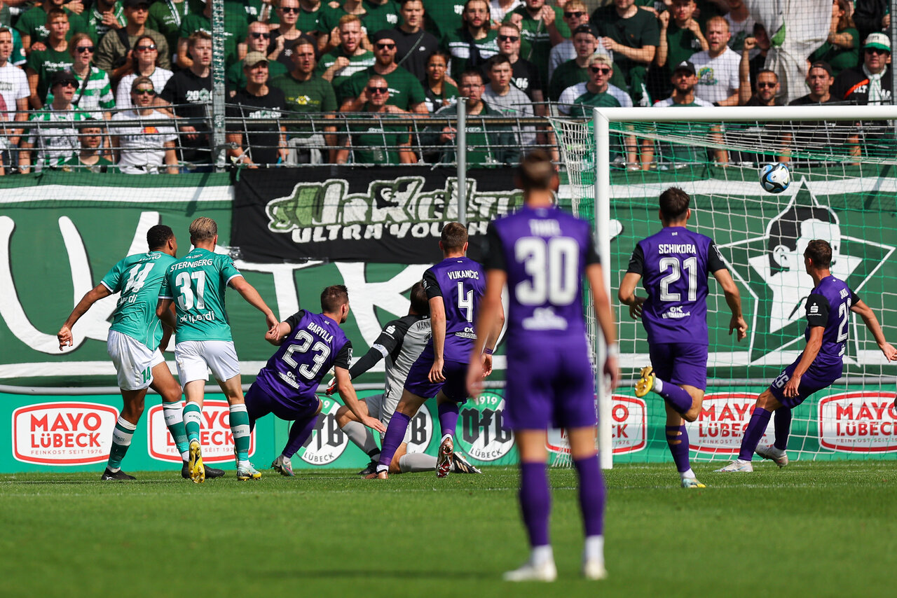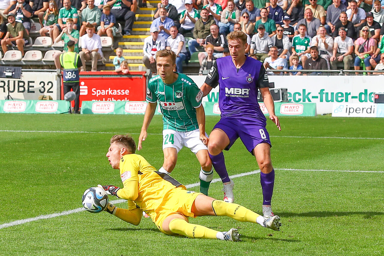 Das Duell der Ungeschlagenen, mit dem VfB Lübeck und dem FC Erzgebirge trafen sich an der Lohmühle zwei Teams, die bislang noch keine Niederlage kassiert haben. Pavel Dotchev musste der hohen Belastung aus drei Spielen in sechs Tagen Tribut zollen und stellte dreimal in der Startelf um. Maximilian Thiel, Erik Majetschak und Joshua Schwirten rückten in die Anfangsformation. Die müden Beine sah man beiden Teams in der Anfangsviertelstunde an. Der VfB stand im eigenen Stadion hoch und erschwerten den Veilchen das Aufbauspiel. Bis auf zwei Halbchancen, die Martin Männel entschärfen konnte, gab es in dieser Phase keine ernstzunehmenden Strafraumszenen.