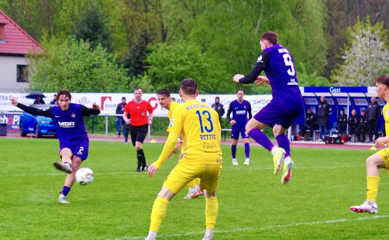 Die Veilchen waren also gewarnt und gefordert. Entsprechend kontrolliert begann Aue die Partie und nahm sofort die Zügel in die Hand. Auf dem holprigen Geläuf im Wesenitzsportpark dauerte es aber gut eine Viertelstunde, bis die Lila-Weißen echte Torgefahr entwickeln konnten. Marvin Stefaniak und Boris Tashchy gaben die ersten Warnschüsse ab, dann kamen die Veilchen zur ersten Ecke. Die trat standesgemäß Marvin Stefaniak und noch während sich Bischofswerda sortierte, flog der Ball in die Mitte. Völlig ungedeckt stieg Marco Schikora in die Luft und köpfte den Ball präzise ins lange Eck. 1:0 für Aue und Bischofswerda war kalt erwischt worden.
