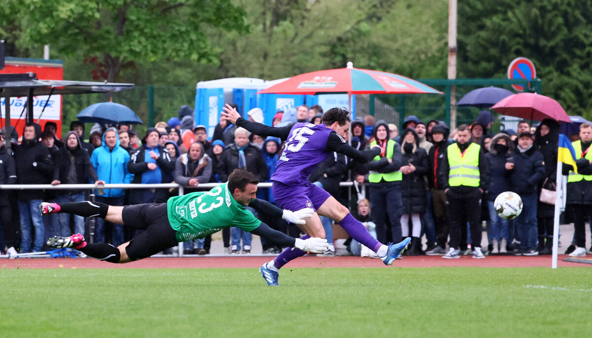 Sofort versuchte die Dotchev-Elf nachzulegen. Erst probierte es Tashchy aus der Distanz, dann steckte er nur wenige Minuten später auf Marcel Bär durch. Der Torjäger der Auer fackelte nicht lange und schweißte die Kugel aus spitzem Winkel ins lange Eck. Nur der Linienrichter unterbrach den Auer Jubel und entschied auf Abseits. Mittlerweile schlug das Wetter um, doch im Regen von Bischofswerda ging es weiterhin nur in eine Richtung. 30 Minuten waren gespielt, da bewies Marvin Stefaniak wieder seine fußballerischen Qualitäten. Mit einem Außenrist-Pass schickte der Mittelfeldspieler Marcel Bär auf die Reise. Diesmal stand der Stürmer nicht im Abseits, umkurvte Keeper Stefan Kiefer und knallte die Kugel unter die Latte zum 2:0.