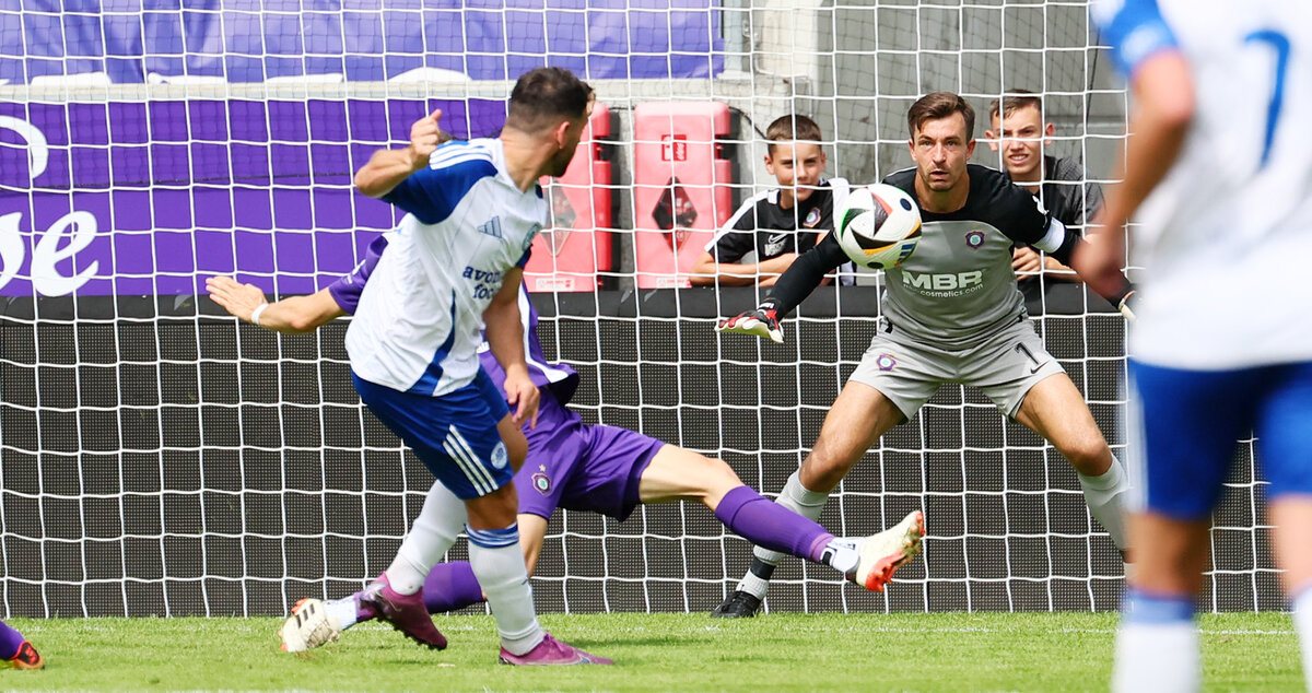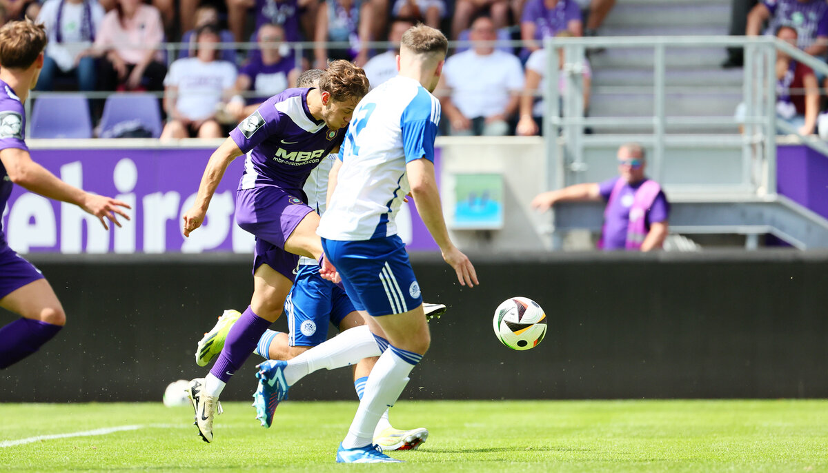 Gleich drei Neuzugänge schafften es in die Europapokal-Elf von Veilchen-Cheftrainer Pavel Dotchev. Während Maxim Burghardt auf der rechten Abwehrseite startete, rückten Jonah Fabisch und Mika Clausen ins Mittelfeld. Herrliches Kaiserwetter und tolle Stimmung auf den Rängen sorgten für einen gebührenden Rahmen des historischen Nachholspiels. Die Erben der Wismut legten sofort los und Aue hatte bereits in der Anfangsphase gute Chancen in Führung zu gehen. Der Trierer Neuzugang Maxim Burghardt rannte auf dem rechten Flügel seinen Bewachern davon und scheiterte bei seinem Abschluss nur noch an Innenverteidiger Barney McKeown. Marcel Bär, der in der vergangenen Saison der Top-Torjäger der Veilchen war, kam wenig später an der Strafraumkante zum Abschluss und verfehlte das Tor nur um wenige Zentimeter.