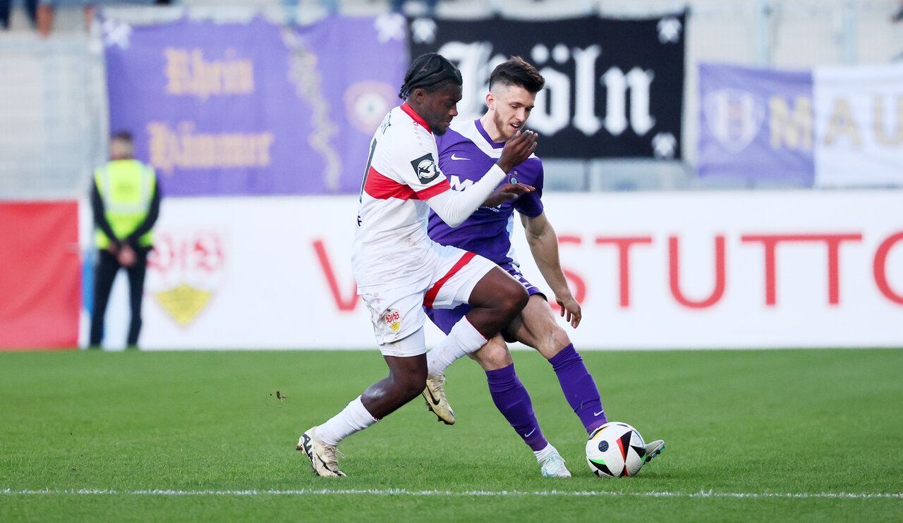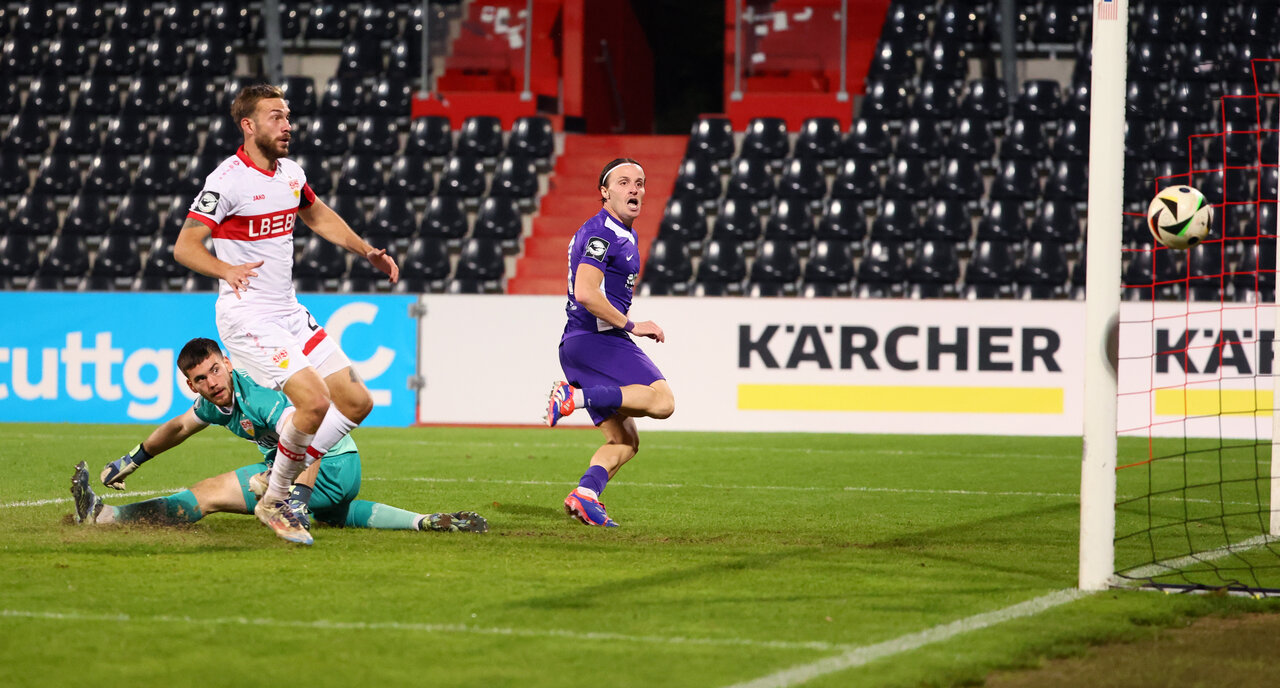 Die erste Hälfte begann mit einer Großchance des VfB, die zweite mit einer für den FCE. Aue startete hellwach und Mirnes Pepic hätte den nächsten Treffer für die Veilchen machen müssen. Aue zwang Stuttgart zu einem Ballverlust im Spielaufbau und Kilian Jakob fasste sich zwanzig Meter vor dem Tor ein Herz und zog ab. Keeper-Talent Dennis Seimen konnte den Einschlag noch verhindern, aber wehrte den Ball vor die eigenen Füße ab. Pepic schaltete am schnellsten und musste aus kurzer Distanz praktisch nur noch einschieben. Doch die Kugel rauschte am rechten Pfosten vorbei und Aue verpasste die Vorentscheidung. Nur Minuten versuchte es Kilian Jakob erneut und nach einem perfekten Seitenwechsel, eingeleitet von Ali Loune zog der Flügelspieler ab und der Ball rauschte knapp einen Meter am Tor vorbei.