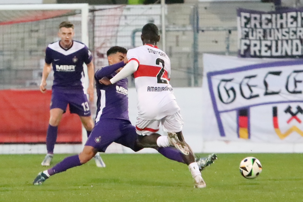 Stuttgart begann stürmisch und aggressiv und versuchte über die Flügel mit ihren Außenstürmern Druck zu machen und das Auer Mittelfeld zu überspielen. Die Veilchen hatten indes Probleme, ihr eigenes Spiel aufzuziehen. Die jungen Spieler des VfB attackierten das lila-weiße Aufbauspiel früh und zwangen die Erzgebirger in ihre eigene Hälfte. Weitere Torchancen oder gar einen Treffer erspielten sich die Hausherren in der Anfangsphase aber nicht. Spätestens im Strafraum bekamen die Veilchen den VfB gestoppt. Die Stuttgarter gaben aber weiterhin den Ton an und hatten in der 16. Minute die Chance, über einen Standard vor das Tor zu kommen. Ob es nun an der Abstimmung oder einer verunglückten Flanke lag, der lange Ball landete ungefährdet in den Armen von Martin Männel und der Kapitän der Veilchen leitete den Konter ein. Auf der linken Seite bewies Mirnes Pepic dann die Übersicht und schickte Marvin Stefaniak auf die Reise. Bis zur Grundlinie trieb der Kreativspieler der Veilchen den Ball und spielte von dort eine maßgenaue Flanke in den Strafraum. Am langen Eck lauerte Marcel Bär, der wieder genesene Torjäger der Veilchen konnte unbedrängt einschieben und brachte die Veilchen unverhofft aber kaltschnäuzig in Führung. 1:0 für den FC Erzgebirge Aue.