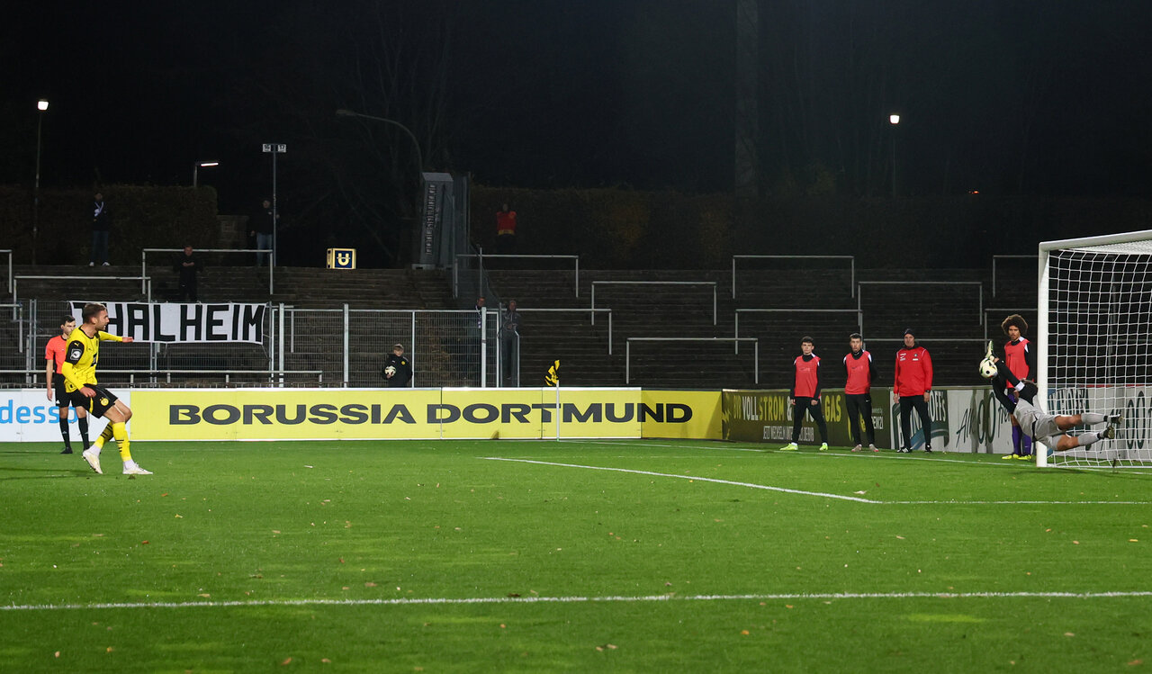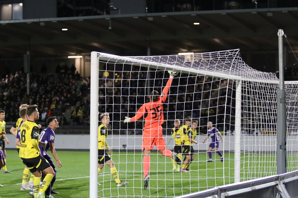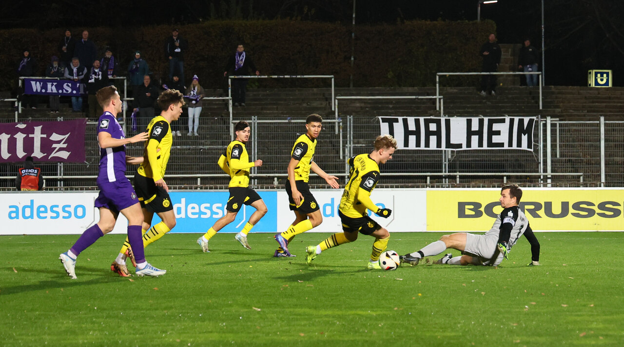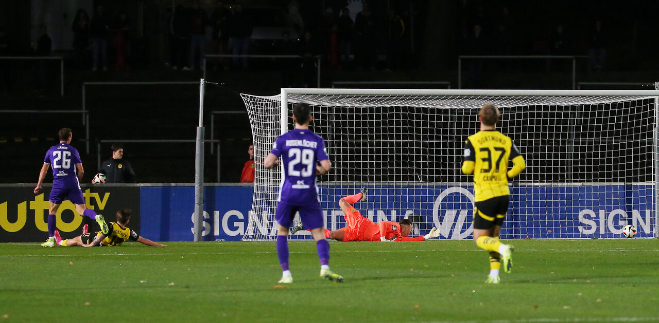 Kurz vor der Halbzeitpause kamen die Veilchen wieder gefährlich in den Dortmunder Strafraum und hatten gleich zwei Großchancen zum Ausgleich. In der 43. Minute bekam der BVB eine Auer Flanke nicht mehr aus der gefährlichen Zone geklärt. Der Ball sprang durch den Strafraum und Ali Loune legte das Leder per Kopf auf Kilian Jakob. Der Torschütze zum 1:0 versuchte es aus gut zehn Metern erneut per Volleyschuss und scheiterte an Abwehrspieler Yannik Lührs. Nur wenige Minuten später hatten die Veilchen gleich doppeltes Aluminium-Pech. Erst scheiterte Marvin Stefaniak mit einem Freistoß aus spitzem Winkel an der Querlatte und der anschließende Klärungsversuch eines Dortmunders prallte an den Pfosten. So ging es mit dem Rückstand in die Pause.