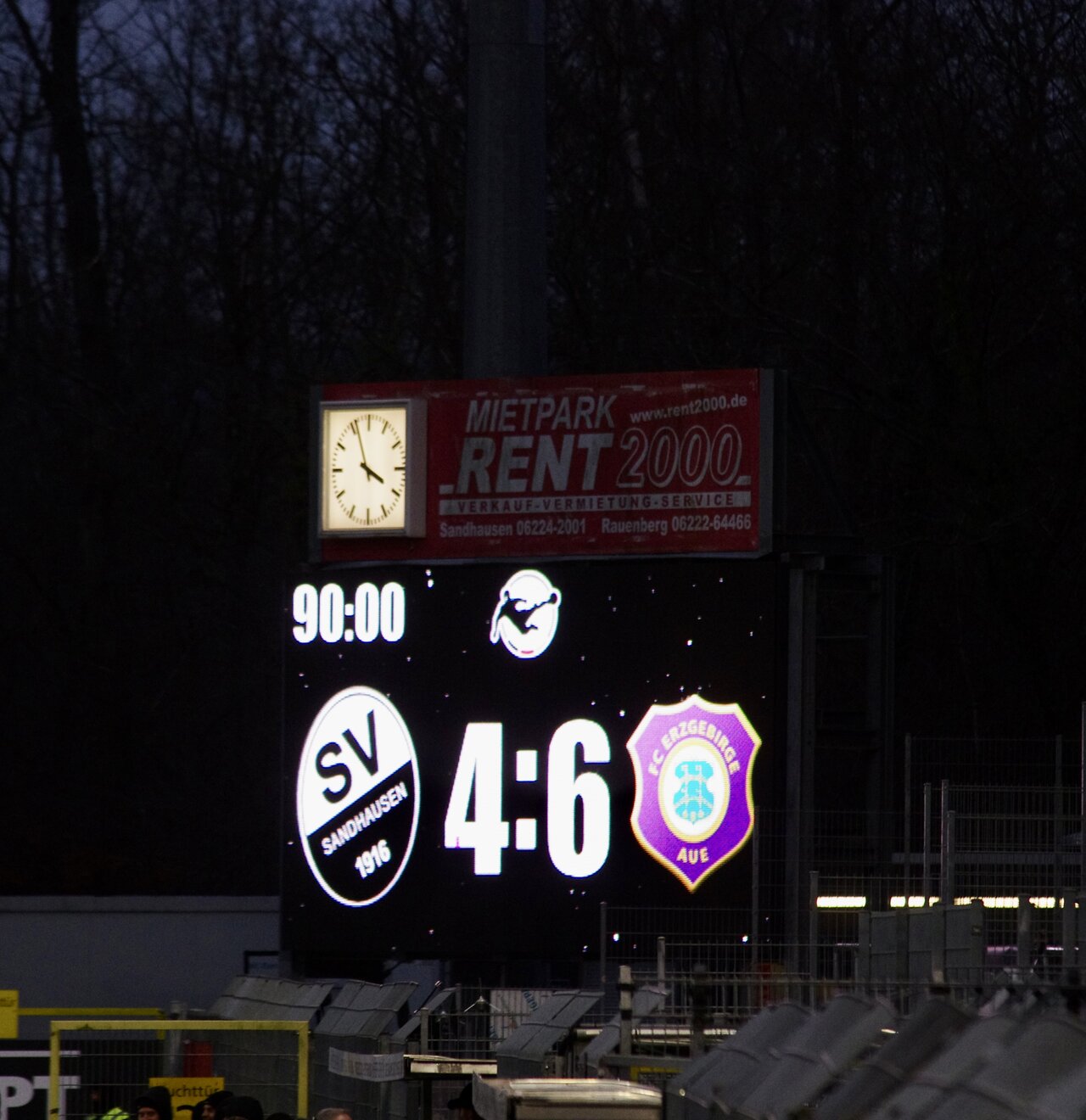 Trotz drei Toren Rückstand bewiesen die Hausherren eiserne Moral. Die Mannschaft von Sreto Ristic lief weiter an und hatte gute Chancen auf das nächste Tor. Zweimal rauschte der Ball nur knapp am Tor vorbei und in der 76. Minute bestrafte der SVS erneut Auer Nachlässigkeiten. Diesmal war es Dominic Baumann, der frei auf das Auer Tor zugehen konnte und den Ball ins Eck versenkte. 3:5 - die Veilchen verteidigten zu sorglos, aber wieder gab die Emmerich-Elf die richtige Antwort. Die Torhymne des SV Sandhausen war noch nicht verklungen, da kombinierte sich Aue wieder in den Strafraum. Mit kühlem Kopf legte diesmal Mirnes Pepic auf und Sean Seitz durfte jubeln. Der Einwechselspieler knallte die Kugel aus kurzer Distanz unter die Latte. 6:3 - der helle Wahnsinn am Hardtwald und in den letzten Zügen der Nachspielzeit fiel sogar das zehnte Tor. Trotz des furiosen Offensivspiels die Ecken der Hausherren bekamen die Auer einfach nicht entschärft. Diesmal traf Jeremias Lorch aus spitzem Winkel und sorgte für den Endstand. Mit 6:4 gewinnen die Lila-Weißen in Sandhausen und melden sich mit einem furiosen Auswärtssieg nach drei Niederlagen zurück.