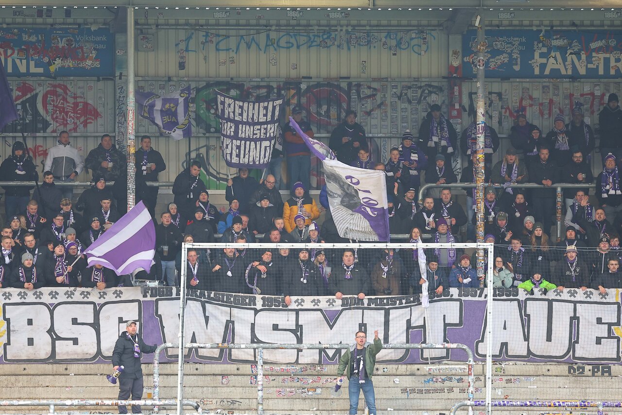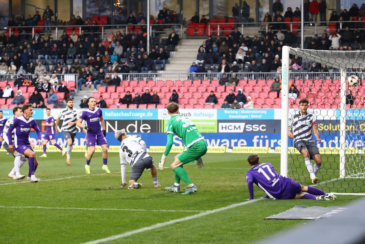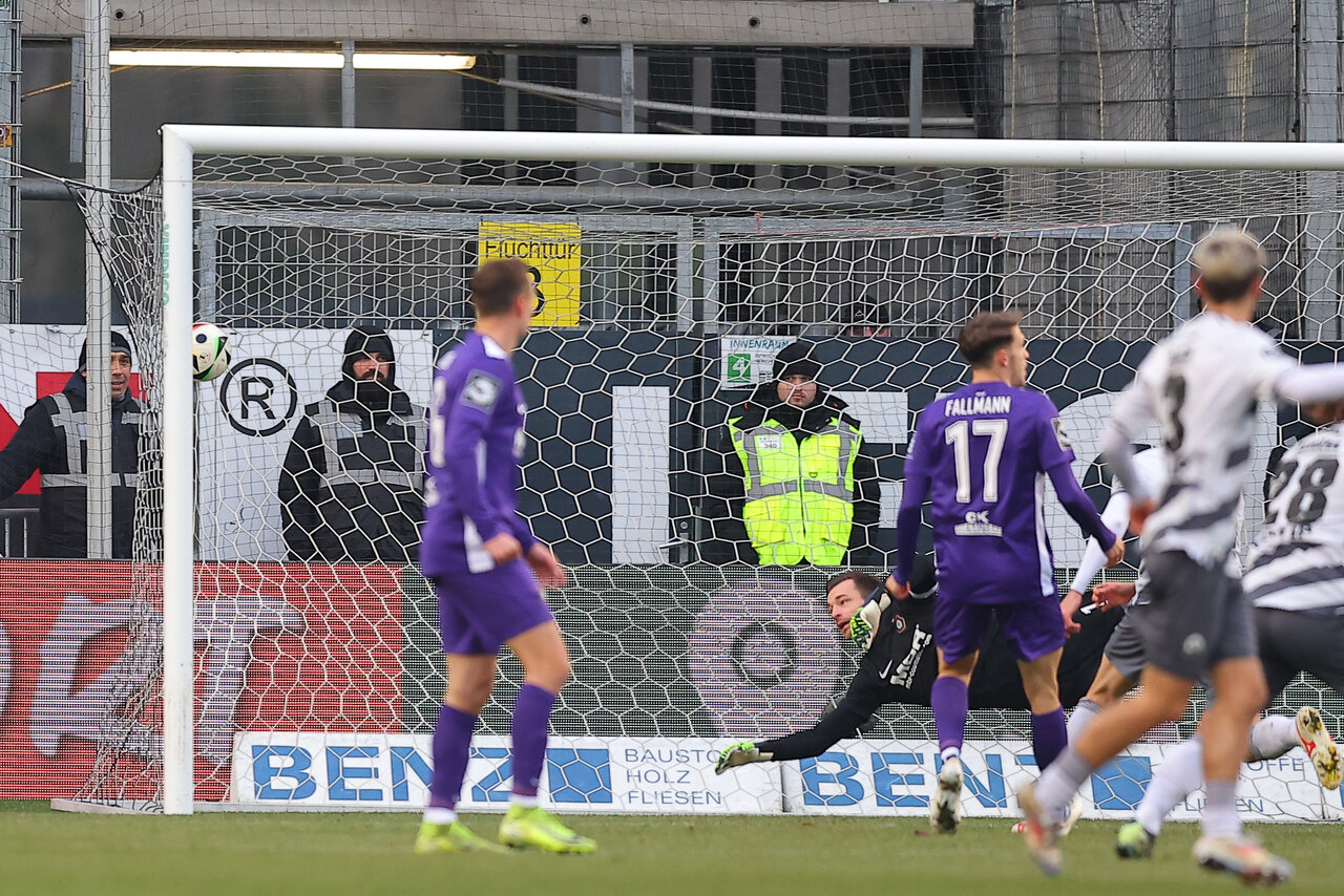 Doch die Lila-Weißen ließen nicht nach. Trotz Rückstand und Niederlagenserie im Rücken spielte Aue mutig und engagiert auf und kam zu Chancen. 17. Minuten waren gespielt, da zog Kilian Jakob über links das Tempo an und sein Querpass landete bei Marcel Bär. Der Stürmer behauptete im Strafraum den Ball und legte mit Übersicht auf den heraneilenden Pascal Fallmann ab. Der Außenverteidiger zog ab, aber Keeper Gorka war zur Stelle und entschärfte die Großchance. Aue arbeitete immer mehr am Ausgleich und in der 26. Minute brachen die Veilchen den Bann. Wieder lief der Angriff über die linke Seite und wieder war es Marcel Bär, der diesmal per Flanke den heranstürmenden Pascal Fallmann suchte und fand. Doch statt abzuschließen, behielt der Österreicher einen kühlen Kopf und legte den Ball clever ab. Omar Sijaric stand goldrichtig und musste den Ball nur noch über die Linie befördern. 1:1 - der hochverdiente Ausgleich für die Schachter.