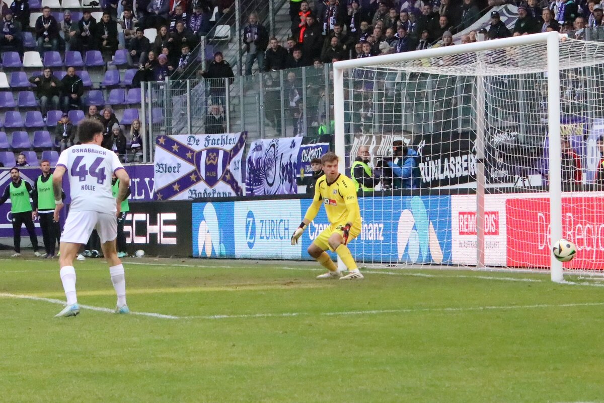Die erste Chance nach dem Seitenwechsel hatten wieder die Auer. Jonah Fabisch zirkelte einen Freistoß aus zentraler Position auf das Tor und Jonsson konnte den Ball nicht festhalten. Omar Sijaric schaltete schnell, konnte den Ball aber nicht am Torwart vorbeibringen. Weiterhin 0:0, aber in der Folge übernahm erstmals der VfL Osnabrück das Spielgeschehen und drängte auf die Führung und provozierte Fehler im Auer Spielaufbau. Wirklich gefährlich wurden die Gäste aber nicht. Ein halbes Dutzend Ecken bekamen die Veilchen verteidigt und den gefährlichsten Torschuss von Lars Kehl kratzte Martin Männel aus dem Eck. Bei den wenigen Chancen der Auer wurde es dafür deutlich brenzliger. Erst setzte sich Omar Sijaric im Strafraum gut gegen zwei Osnabrücker durch und scheiterte nur am Abschluss und in der 70. Minute ging ein Raunen durch das Erzgebirgsstadion. Linus Rosenlöcher hatte eine Ecke von links weit in den Strafraum geschlagen und Erik Majetschak legte stark auf Marcel Bär ab, der sich drehte, abzog und nur am Pfosten scheiterte.