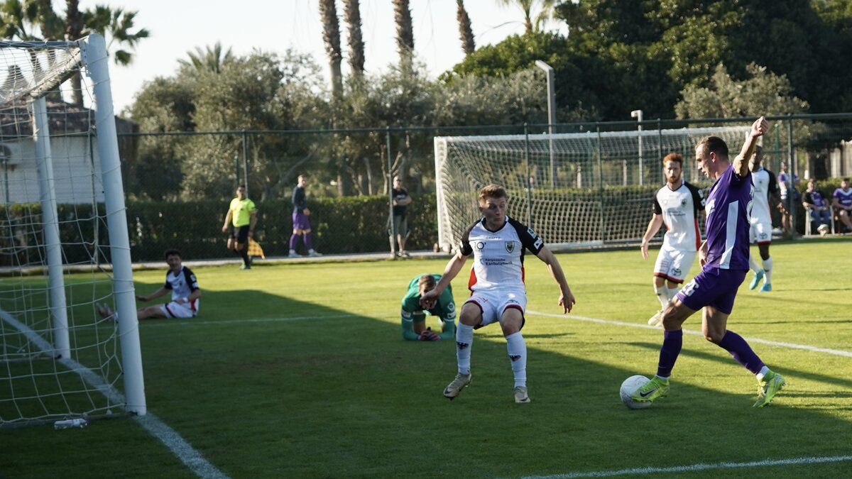 Am Ende einer intensiven und kräftezehrenden Woche Trainingslager raffte sich der FCE zunächst zu einer bärenstarken Leistung auf. Griffig, mutig, zielstrebig agierte das Team aus Aue, stand kompakt in der Defensive und erspielte sich mehrere klare Torchancen gegen den Aufstiegsaspiranten in die höchste Spielklasse des Nachbarlandes. Von der Strafraumgrenze scheiterten nach guten Spielzügen und Rückpass Linus Rosenlöcher und Ali Loune noch, ehe Kilian Jakob am langen Pfosten zum absolut verdienten 1:0 traf (25.). Omar Sijaric mit gewonnenem Kopfballduell und Pascal Fallmann per Querpass hatten die Vorarbeit geliefert. Kurz vor der Pause hatte der agile Mika Clausen das 2:0 auf dem Fuß, war aus Nahdistanz aber zu überrascht an den Ball zu kommen. Mit hohem Tempo und beeindruckender Intensität führte der FC Erzgebirge bei Halbzeit und musste sich lediglich vorwerfen lassen, angesichts der Top-Vorstellung nicht deutlicher vorn zu liegen.