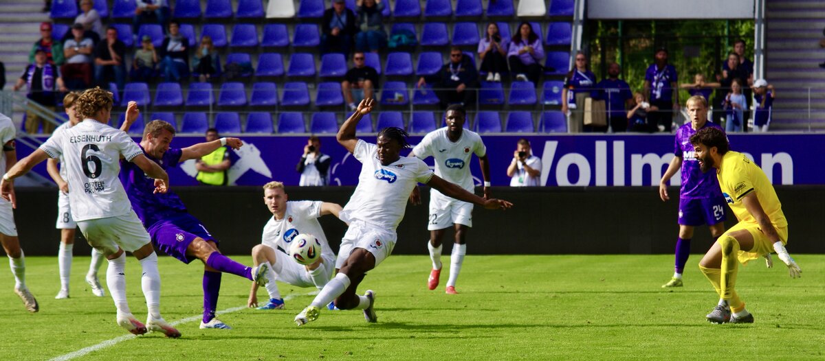 Gleich von Beginn übernahmen die Lila-Weißen die Initiative und legten los. Bereits in den ersten zehn Minuten hätte der Ball im Kölner Tor zittern müssen. Maximilian Schmid eröffnete die Drangphase und erlief stark einen Ball im Strafraum. Aus spitzem Winkel kam der Auer Stürmer an Dudu im Tor aber nicht vorbei. Aue blieb dran, presste den Gegner früh und provozierte Fehler. Marvin Stefaniak hatte die nächste Gelegenheit und zielte aus gut zwanzig Metern zu weit nach links. Binnen der ersten zehn Minuten hatten die Auer zwei weitere Chancen durch Clausen und Guttau, im Tor hielt Keeper Dudu aber die Null und die Hausherren verpassten die frühe Führung. Die Viktoria überstand das Auer Anlaufen und in der 20. Minute demonstrierten die Höhenberger eindrucksvoll, was Effektivität ist. Mit dem ersten echten Angriff und Torabschluss gingen die Gäste in Führung. Viel zu passiv verteidigten die Veilchen den Strafraum und nach einer Flanke von Yannik Tonye konnte David Otto den Ball per Kopf auf Leonhard Münst verlängern. Der Kölner hatte aus kurzer Distanz keine Mühe und nickte ein. Nach 4:1 Torschüssen stand es im Lößnitztal 0:1.