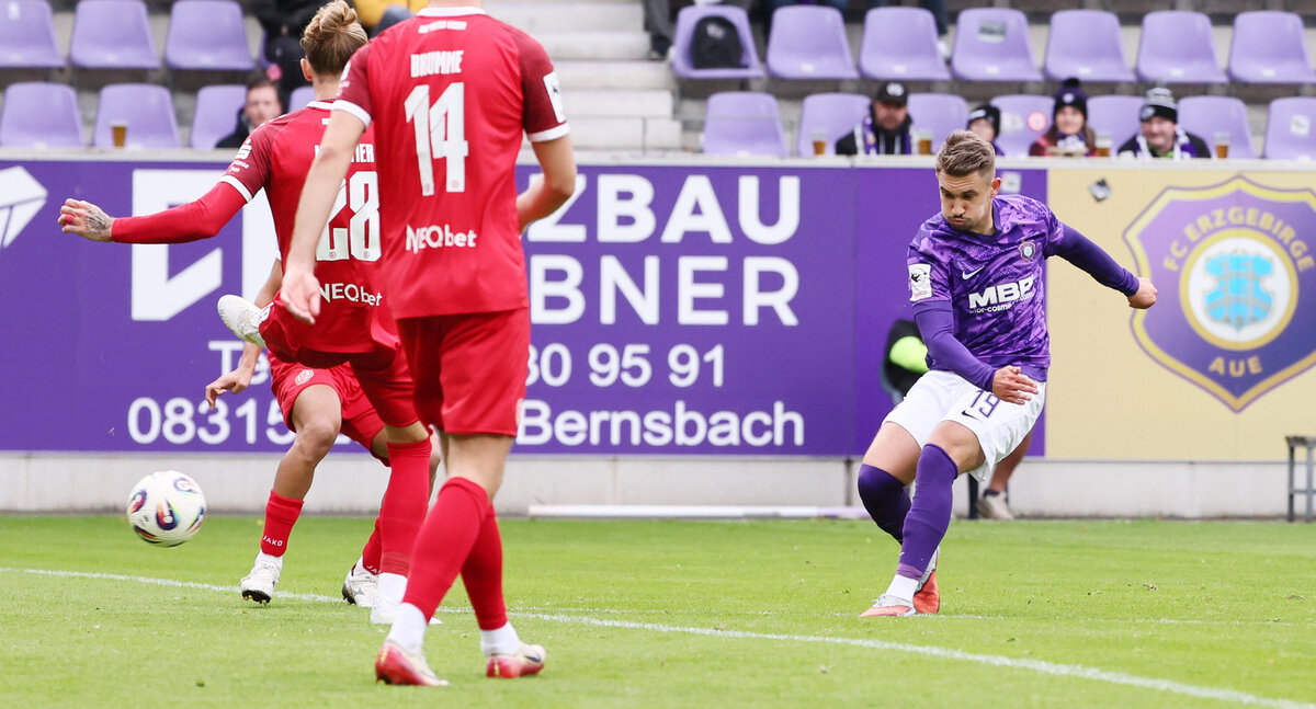 Abschluss der Englischen Wochen im Erzgebirge - nach zwei Siegen gegen 1860 München und Alemannia Aachen empfingen die Veilchen am Sonntag Rot-Weiss Essen im heimischen eins-Erzgebirgsstadion. In einer abwechslungsreichen Partie ging Aue zweimal im Führung, am Ende reichte es aber nicht für die volle Punktzahl. Unser Spielbericht.