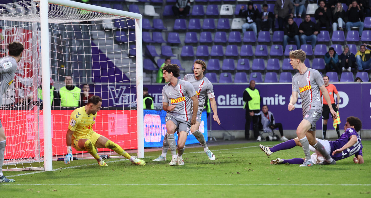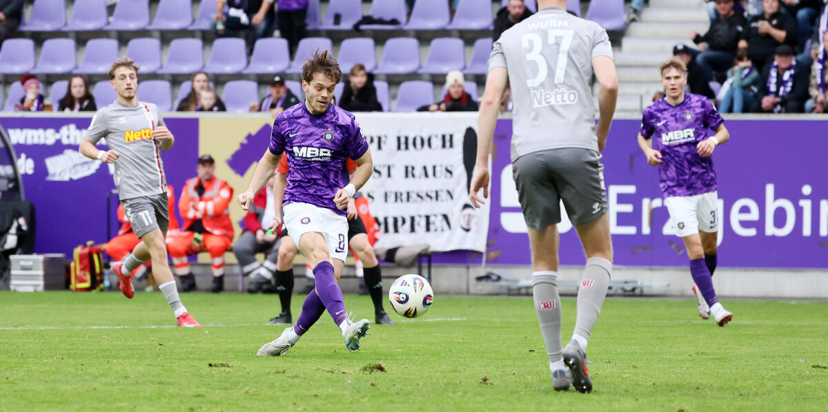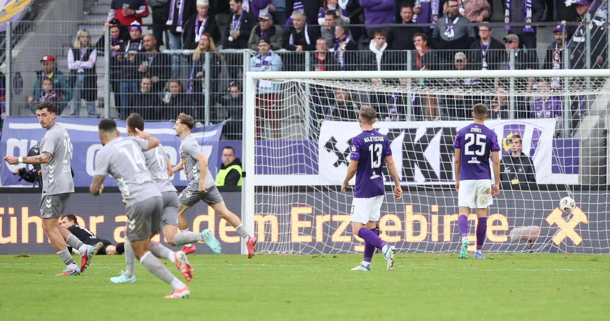 Die nächste Druckphase der Auer läutete Paul Seidel ein. Der Linksverteidiger fasste sich aus gut 20 Metern ein Herz und zog ab. Wieder parierte Gebhardt sehenswert und klärte zur Ecke. Die Veilchen blieben dran und schnürten Regensburg regelrecht ein. Für das nächste Tor brauchten die Veilchen aber keine Durchschlagskraft, sondern einen Geniestreich. In der 54. Minute legte sich Julian Guttau die nächste Ecke zurecht. Statt hoch hinein zirkelte die Nummer 19 den Ball auf den kurzen Pfosten. Völlig überrascht von der scharfen Hereingabe bugsierte Keeper Gebhardt den Ball über die eigene Linie. 2:1 – die Veilchen waren mit dem vierten Saisontor von Julian Guttau wieder in Führung gegangen.