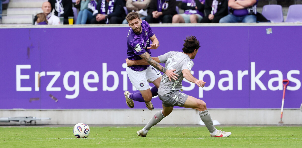 Aber die Auer wollten mehr und drängten in der Folge auf die Entscheidung. Immer wieder suchten die Spielmacher den schnellen und agilen Jannic Ehlers, der sich im Laufduell immer wieder behaupten konnte. Der Auer Stürmer hatte das 3:1 auf dem Fuß, aber statt der Entscheidung kassierten die Lila-Weißen den bitteren Ausgleich. Genau eine Stunde war im Schacht gespielt, da spielte Benedikt Saller einen perfekten Schnittstellenpass auf Sebastian Stolze und der Routinier schlenzte den Ball unhaltbar für Männel in die Maschen. 2:2 - der erneute Ausgleich und für die Veilchen kam es noch dicker. Keine zehn Minuten später kam der eingewechselte Benedikt Bauer vom Jahn vor dem Strafraum an die Kugel. Jonah Fabisch stellte sich in den Weg und versuchte den Schuss zu blocken, aber abgefälscht vom Fuß des Aushilfs-Rechtsverteidiger flog der Ball genau ins kurze Eck. 2:3 - Regensburg hatte das Spiel im Erzgebirge gedreht und die Veilchen, die bislang ein starkes Heimspiel abgeliefert hatten, lagen zurück.