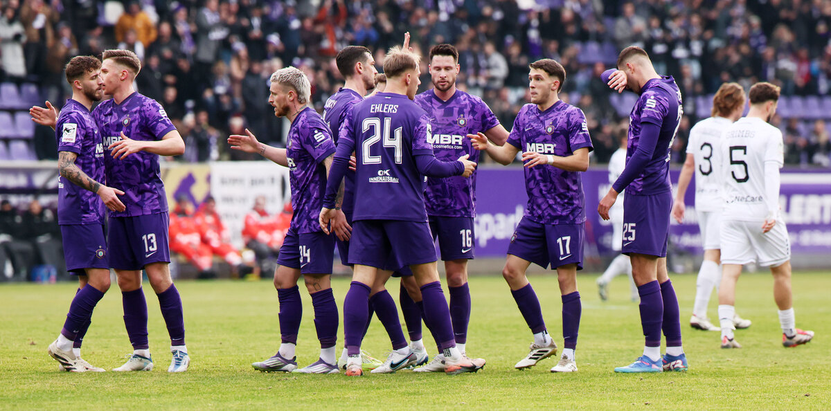 Dank der Fortuna und dem Lord stand die Null bei den Veilchen, aber das nächste Tor wollte auf der anderen Seite ebenfalls nicht fallen. Schweinfurt riskierte viel und ließ der Auer Offensive einige Räume. In der 25. Minute setzte Stefaniak Flügelpartner Moritz Seiffert ein, der querlegte und im Zentrum Mika Clausen fand. Der Achter der Auer jagte das Spielgerät aber an den Querbalken und verpasste auch wenige Minuten später das zweite Tor. Nach einer Schweinfurter Ecke konterte die Härtel-Elf und erneut schickte Seiffert Clausen auf die Reise. Frei vor dem Tor suchte Clausen aber nicht den Abschluss. Sein Querpass auf Jannic Ehlers ging ins Leere. Zwar hatte die Partie mittlerweile schon drei oder vier Tore verdient gehabt, wirklich hochklassig war das Aufeinandertreffen der Kellermannschaften aber nicht. Die Fans im Schacht sahen viele Fehler und Ungenauigkeiten auf beiden Seiten. Kurz vor der Pause bescherte Schweinfurt Aue erneut. Nach einer Ecke von rechts versuchten drei Schnüdel, den Ball aus dem Fünfer zu schlagen. Ekin Celebi beförderte das Spielgerät dabei über die Linie. Das nächste Eigentor – 2:0 für den FC Erzgebirge Aue.