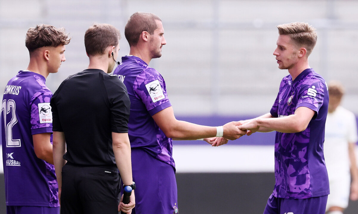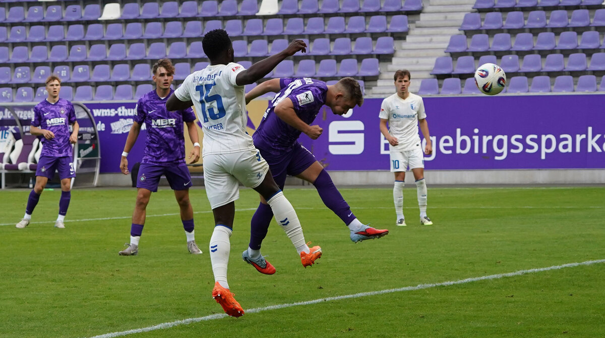 Der Vertreter der 2. Bundesliga bemühte sich zunächst um geduldige Ballkontrolle, doch die Veilchen verschoben kompakt und ließen kaum Torchancen und Pässe in die Tiefe zu. Einmal musste Louis Lord dann aber doch zupacken, verhinderte mit einer starken Doppel-Parade aus Nahdistanz einen möglichen Rückstand (11.). Nach vorn hatten die Hausherren immer wieder gute Aktionen. Jannic Ehlers fand nach Grundliniendurchbruch keinen Abnehmer im Zentrum (13.), dann verpasste Mika Clausen um einen halben Schritt den Pass von Jonah Fabisch (18.) du Marvin Stefaniak verfehlte mit einem Flachschuss aus 18 Metern knapp das kurze Eck (28.). Sehenswert auch der Zuckerpass von Marvin Stefaniak in die Schnittstelle zu Mika Clausen, der wohl ganz knapp im Abseits stand und frei durch gewesen wäre (40.). Aufregung gab es nach 35 Minuten, als Maxi Schmid kurz hinter der Mittellinie den Ball erkämpfte und allein Richtung Tor zugelaufen wäre, dieses Foulspiel wäre in der Liga vermutlich als Notbremse gewertet worden. Der Referee beließ es bei Gelb, der FCE-Stürmer verletzte sich dabei jedoch und musste zur Pause raus.