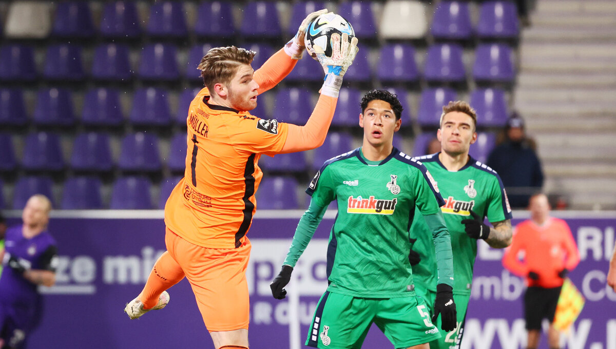 Die Zebras aus dem Ruhrpott blieben weiterhin passiv und mussten sich auf ihren Schlussmann verlassen. Omar Sijaric schickte nach gut zwölf Minuten seinen Flügelpartner Tim Danhof mit einem Schnittstellenpass auf die Reise. Danhof ging in den Strafraum und zog ab, wieder war Müller zur Stelle und vereitelte das Tor. Die Veilchen verpassten die frühe Führung und der MSV meldete sich mit einem Knall. Nach gut 22 Minuten kombinierten sich die Zebras vor den Auer Strafraum, wo sich Sebastian Mai ein Herz fasste und aus einiger Distanz draufhielt. Der Kracher des MSV-Kapitäns klatsche an die Querlatte. Die Veilchen im Glück und der Warnschuss weckte die Veilchen auf. Nach einer Grätsche von Niko Vukancic kam Boris Tashchy im Mittelfeld an den Ball. Der Zehner der Veilchen setzte sich stark gegen seine zwei Bewacher durch, ging in den Strafraum und legte die Kugel an Müller vorbei ins rechte untere Eck - 1:0.