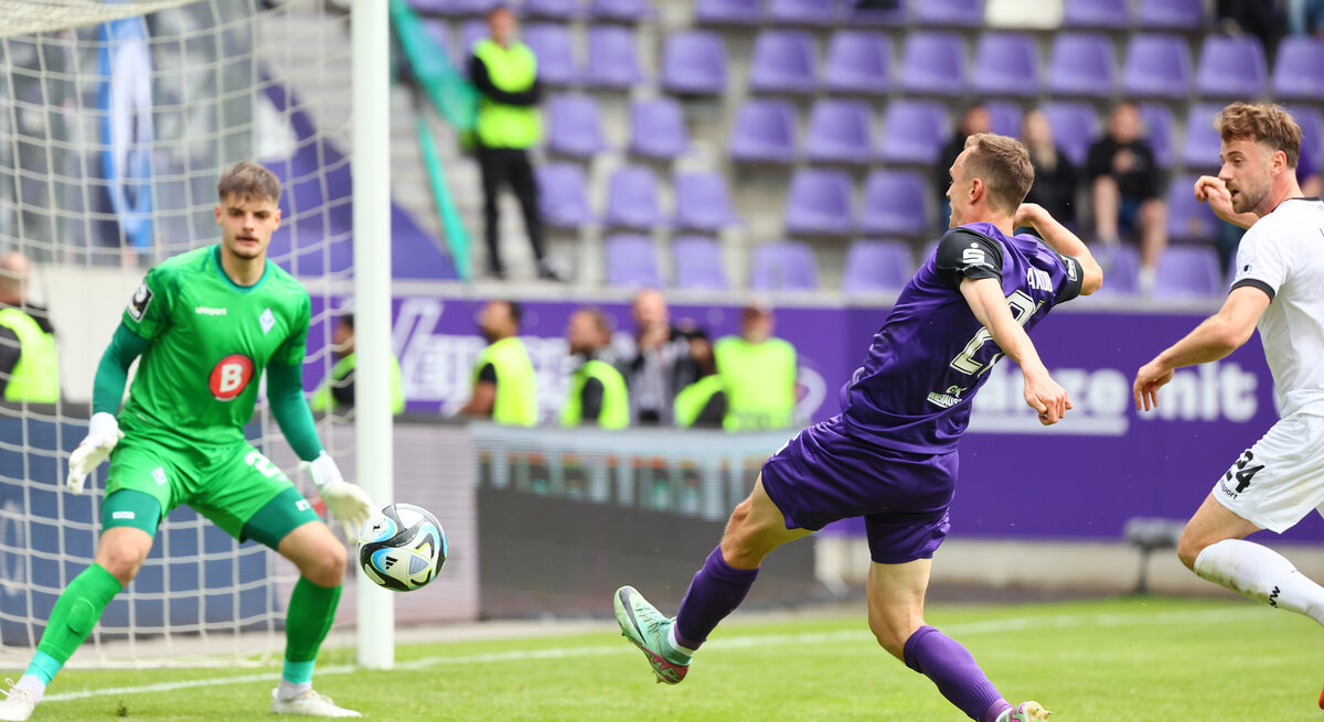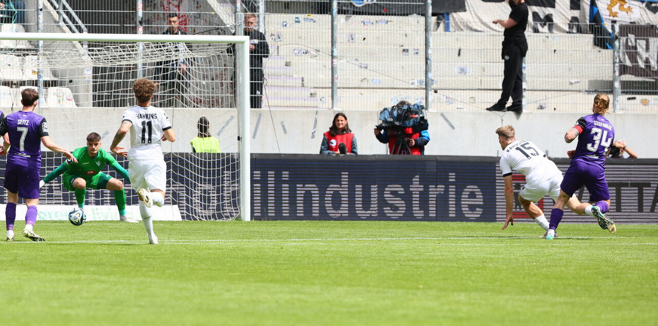 Zum letzten Heimspiel der Saison rotierte Veilchen-Trainer Pavel Dotchev zweimal in der Startelf. Louis Lord gab sein Liga-Debüt für die Lila-Weißen und stand zwischen den Pfosten, während Korbinian Burger in die Innenverteidigung neben Erik Majetschak rückte. Während die Gäste vom Waldhof schon am vergangenen Spieltag den Klassenerhalt feiern konnten, bestand bei den Veilchen noch die Chance auf den vierten Tabellenplatz zu springen und die direkte Qualifikation für den DFB-Pokal klarzumachen. Dementsprechend druckvoll begannen die Veilchen. Marvin Stefaniak versuchte es bereits nach drei Minuten aus der Distanz, sein strammer Schuss ging aber deutlich über die Querlatte des Mannheimer Tors. In der 9. Minute machte es der Kreativspieler des FCE besser. Hellwach schnappte sich Stefaniak den Ball in der gegnerischen Hälfte und ging direkt auf das Tor zu. Malwin Zok im Mannheimer Tor konnte nur hinterherschauen, der platzierte Flachschuss von Stefaniak schlug im linken Eck ein. 1:0 - die frühe Führung für die Veilchen durch das 9. Saisontor der Nummer 34.