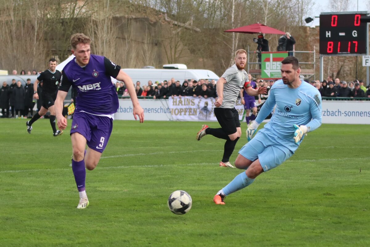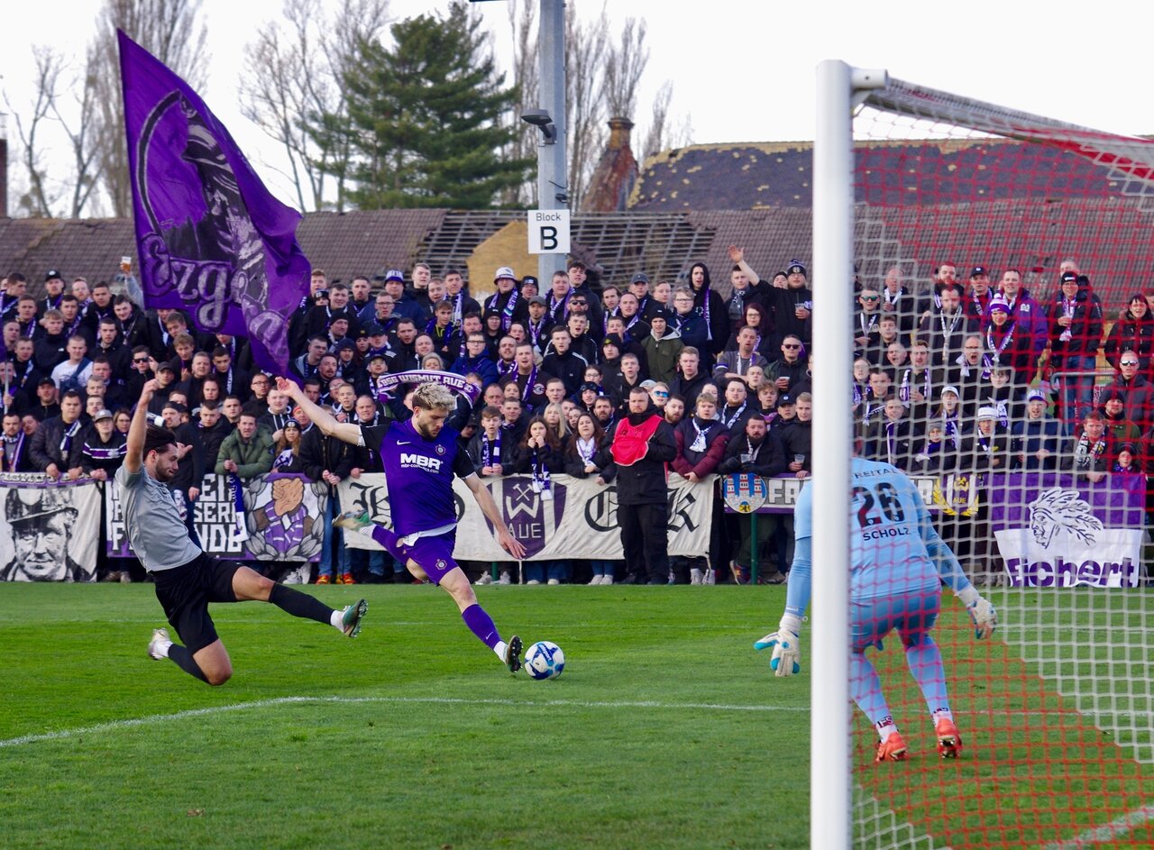 Aue blieb aber am Ball. Keine vier Minuten später legte Marvin Stefaniak per Hacke für Marco Schikora auf, der aber aus kurzem Winkel über den Kasten schoss und in der 36. Minute kombinierten sich die Veilchen erneut in den Strafraum der Freitaler. Mirnes Pepic kam zum Abschluss, aber wieder hielt Scholz stark und verhinderte die Führung für lila-weiß. Aue kontrollierte das Spiel, verpasste es aber, dieses Übergewicht auf die Anzeigentafel zu bringen. Diese zeigte in Grimma auch nach 45 Minuten noch das 0:0.