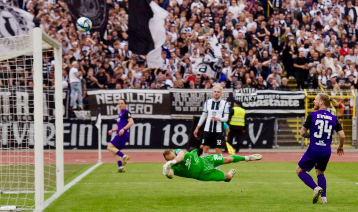 Der FCE sah wie der verdiente Sieger aus, als Ulm mit dem Mut der Verzweiflung alles nach vorn warf. In der 94. Minute bekamen die Gäste erst einen Freistoß nach Foul an Korbinian Burger nicht und dann auch noch einen Einwurf fälschlicherweise gegen sich. Daraus resultierte ein Linksschuss, der weit am Tor vorbei gegangen wäre – hätte Torschütze Kastanaras nicht den Fuß hingehalten und zum 2:2 aus sieben Metern getroffen. Mitten ins Herz der Veilchen, die um den verdienten Lohn einer sehr guten Leistung gebracht wurden.