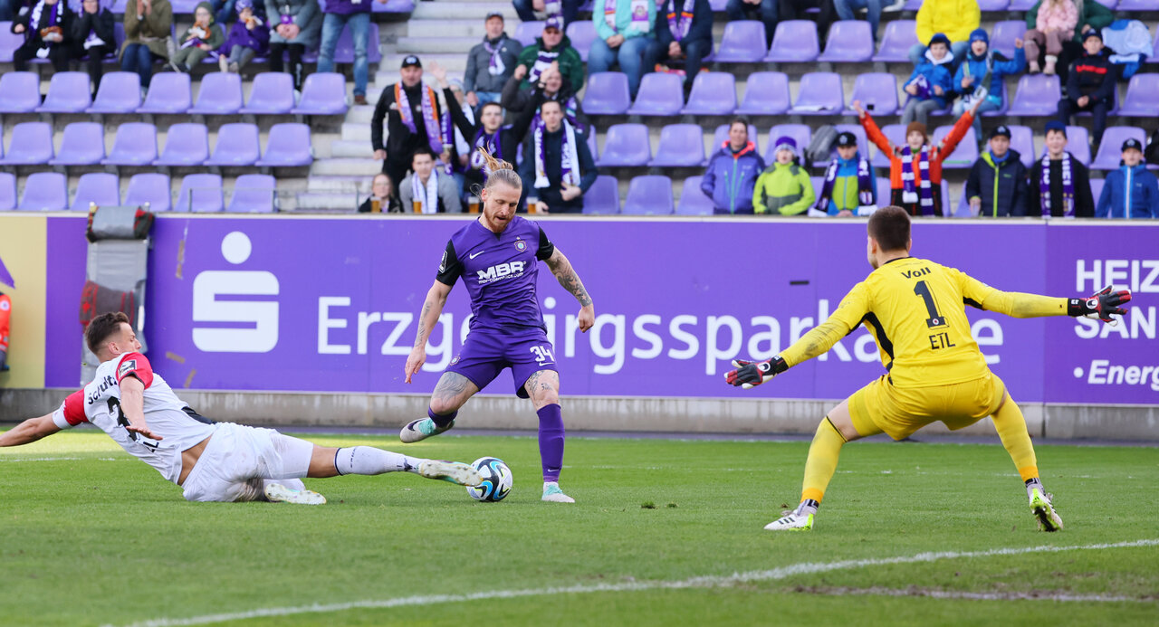 Das Wetter wurde immer rauer und nach dem Ausgleich der Veilchen lieferten sich beide Mannschaften einen harten Kampf auf dem immer tiefer werdenden Boden des Erzgebirgsstadions. Steffen Nkansah, Luca de Meester und Luca Marseiler sahen nach Foulspielen jeweils die Gelbe Karte und trotzdem blieben die Veilchen das bessere Team und drängten auf die Führung. In der 68. Minute verlagerten die Lila-Weißen einen Angriff auf die rechte Seite und der Ball kam zu Anthony Barylla. Der Auer Innenverteidiger, der nur durch die Personalsorgen auf seiner einst gelernten Position auflief, bewies alte Stärke und flankte den Ball scharf in den Strafraum der Kölner. Hier flog der Ball an Auern und Kölnern vorbei und am langen Pfosten lauerte Marvin Stefaniak. In der ersten Halbzeit hatte Stefaniak noch zweifach vergeben, aber diese Chance ließ sich der Kreativspieler nicht entgehen. Per Kopf drückte Stefaniak den Ball über die Linie und erzielte mit seinem fünften Saisontreffer das verdiente 2:1.