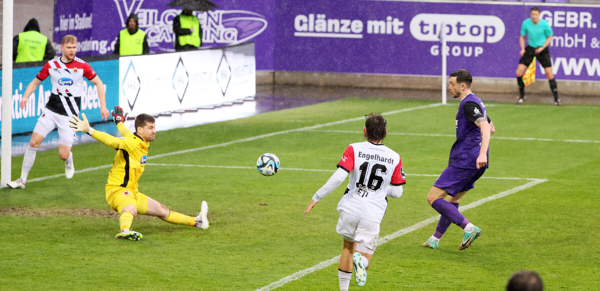 Das Spiel war gedreht und in der Folge hätten die Veilchen sogar mehrere Tore nachlegen müssen. Erst scheiterte Steffen Meuer, nach einer perfekten Flanke von Anthony Barylla, am Torhüter der Kölner, dann köpfte Erik Majetschak in der 84. Minute nur Zentimeter am linken Pfosten der Viktoria vorbei. Die Entscheidung hätte spätestens in der 88. Minute fallen müssen, diesmal bediente Mirnes Pepic den eingewechselten Joshua Schwirten, aber wieder blieb Ben Voll im Tor der Kölner Sieger und verhinderte den dritten Auer Treffer. So blieb es bis in die Schlussminuten spannend. Auch im Hinspiel hatten die Veilchen ein 0:1 gedreht. Damals glich Köln noch in der letzten Minute aus. Die Viktoria bemühte sich, kam an diesem Nachmittag aber nicht mehr zu einer gefährlichen Abschlusssituation. Die Veilchen brachten den Sieg über die Zeit und die Mannschaft von Pavel Dotchev leistete nach zwei Niederlagen in Folge vor den heimischen Fans Wiedergutmachung.