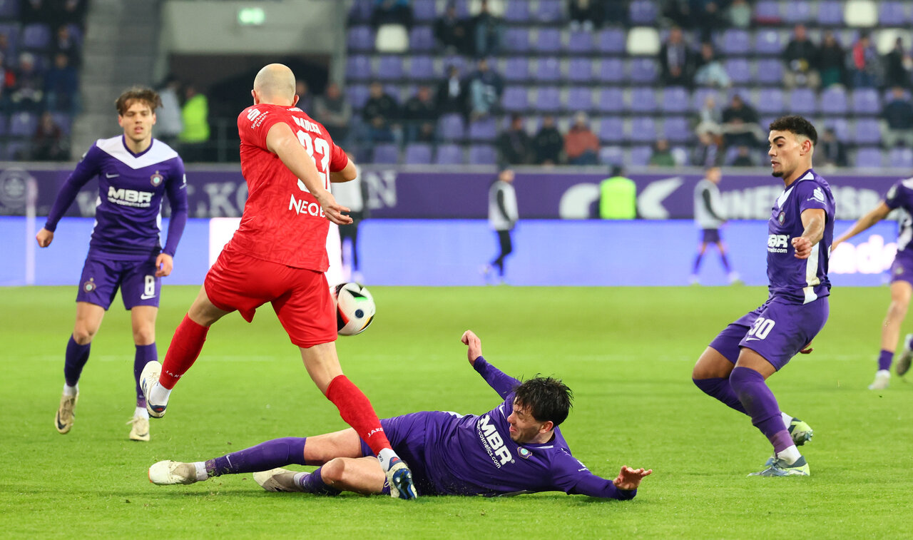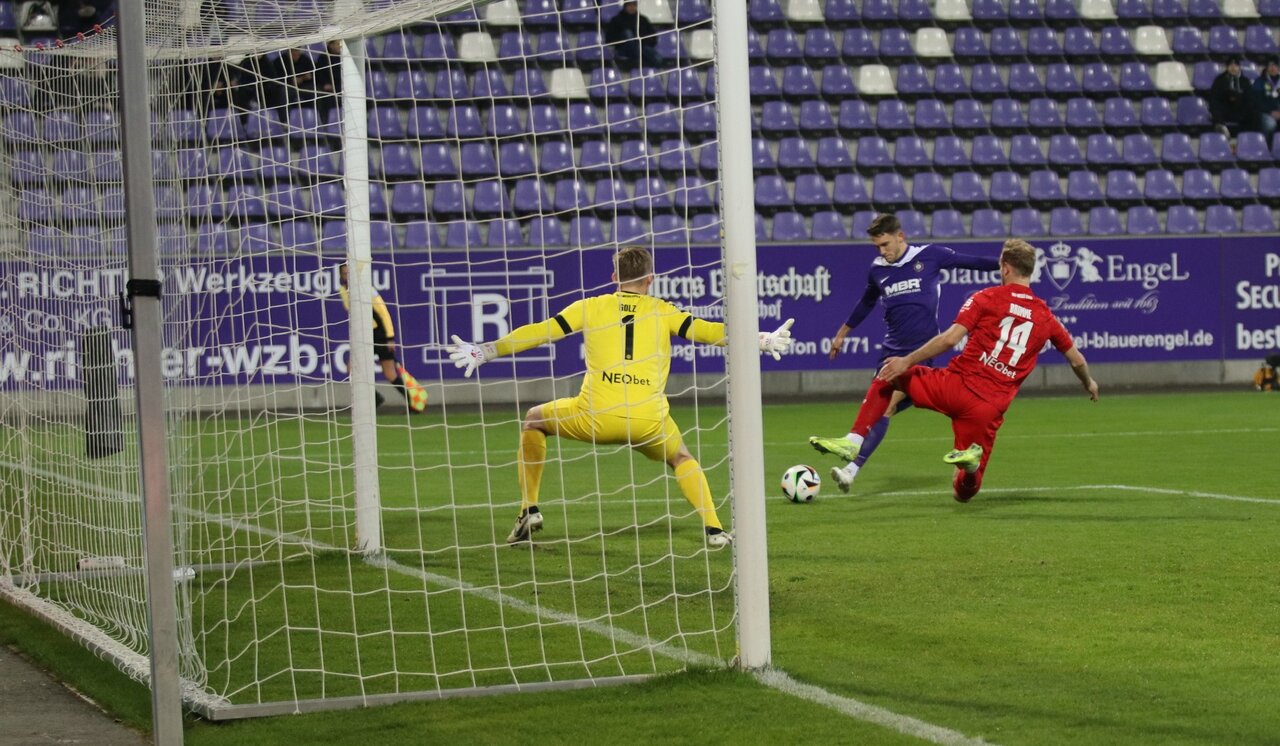Bei Flutlichtschein ging es im Erzgebirgsstadion in die Partie. Essen eröffnete und hatte die erste Torannäherung. Nach einem Freistoß von der linken Seite kam der Ball zu Tobias Kraulich, der das Leder zwar mitnehmen konnte, aber nicht in Schussposition kam. Aue versteckte sich nicht, die Veilchen brachten aber über zehn Minuten, um den Essener Riegel das erste Mal zu überspielen. Angetrieben über die linke Seite kam der Ball zu Kilian Jakob, der Marcel Bär im Zentrum suchte und hoch in den Strafraum flankte. Der Torjäger stieg wie schon gegen Saarbrücken in die Luft, aber das Leder brachte er nicht auf den Kasten. Stattdessen verlängerte sich der Ball ans lange Eck und hier lief Rechtsverteidiger Pascal Fallmann ein. RWE-Keeper Jakob Golz und Abwehrspieler Lucas Brumme warfen sich noch in den Schuss, aber Fallmann platzierte den Ball genau und versenkte den Ball im Netz. 1:0 für den FC Erzgebirge Aue, das erste Tor des Österreichers im Veilchentrikot und ein verspätetes eigenes Geschenk zum 21. Geburtstag in der abgelaufenen Woche.