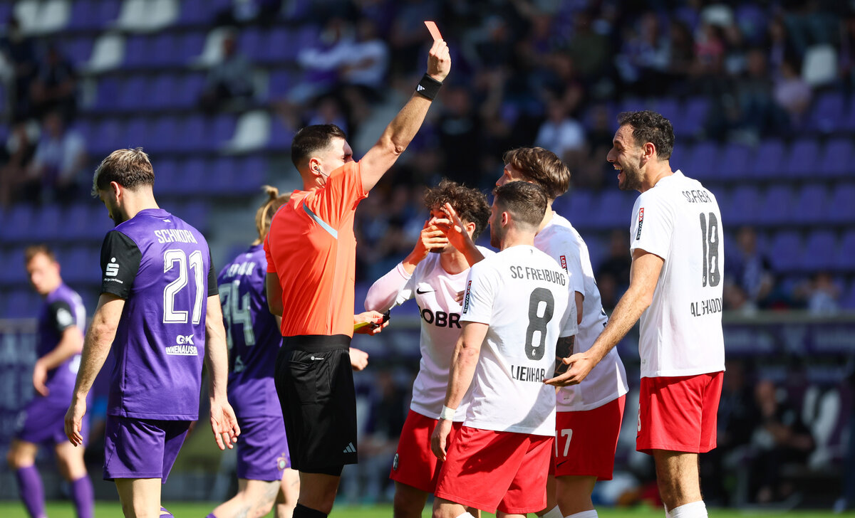 Keine Tore im ersten Durchgang und der erste Aufreger nach dem Seitenwechsel war ebenfalls ein Torjubel. In der 53. Spielminute forderten die Freiburger ein Foulspiel, nachdem Kilian Jakob in einem Pressschlag hart aber fair den Ball erkämpft hatte. Der bereits verwarnte Hamadi Al Ghaddioui beschwerte sich vehement und kassierte von Schiedsrichter Timon Schulz den zweiten gelben Karton und flog damit vom Platz. Aue plötzlich in der Überzahl und die Lila-Weißen schalteten sofort einen Gang nach oben. Nur vier Minuten nach dem Platzverweis kombinierten sich Jakob und Stefaniak sehenswert über die linke Seite. Die Hereingabe fand im Zentrum Marcel Bär, der den Ball annehmen konnte und abzog. Freiburgs Torwart Niklas Sauter war mit einer Glanzparade zur Stelle und parierte. Wenige Minuten später hatte der Schlussmann der Gäste dann aber keine Chance mehr.