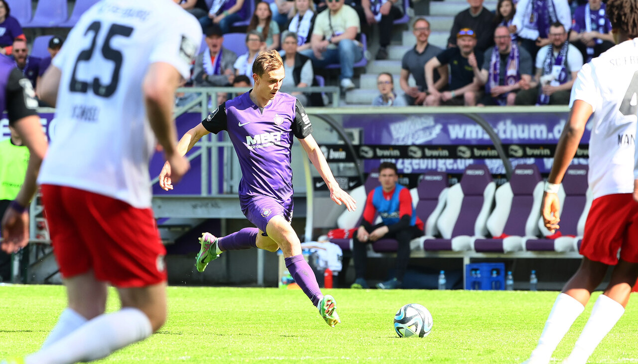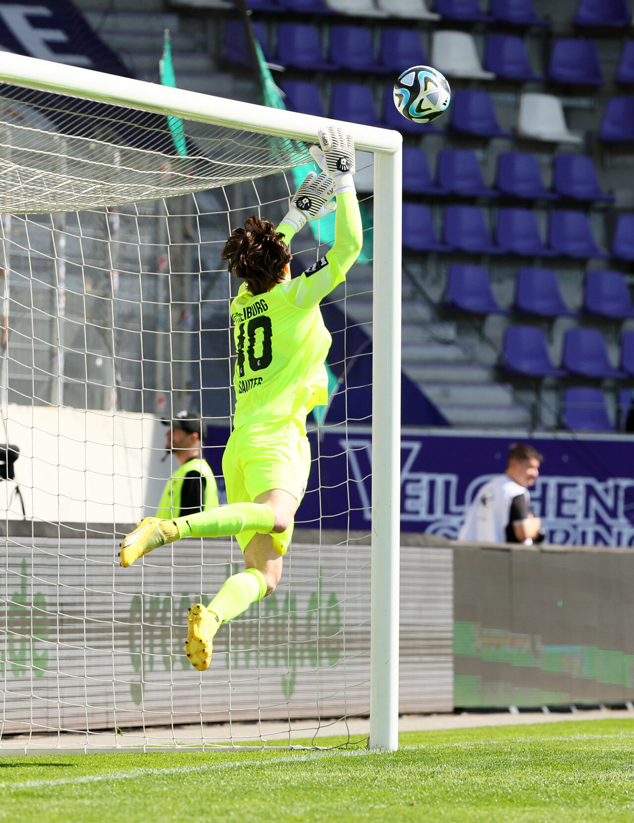 Beim Schuss von Kilian Jakob in der 63. Minute hatte Sauter keine Abwehrchance mehr. Aue lief immer wieder über die Flügel an und suchte im Zentrum Marcel Bär und Boris Tashchy. Jakob lauerte im Rückraum und nach einer zu kurz geklärten Flanke fackelte der Linksverteidiger nicht lange und schweißte die Kugel mit einem Strahl aus 20 Metern unhaltbar ins lange Eck. Sauter streckte sich, aber gegen den platzierten Schuss hatte der Keeper keine Chance. 1:0 für die Veilchen, die sich nach einigen Anläufen endlich belohnen konnten. Für Jakob war es im 32. Spiel in lila-weiß das erste Pflichtspiel-Tor.