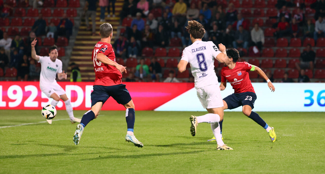 Haching drehte auf und Aue machte das Tor. In der 42. Minute versuchten die Gastgeber die Auer Hintermannschaft mit einem schnell ausgeführten Freistoß zu überspielen. Maxim Burghardt verteidigte wachsam und hielt den Ball im Spiel, während Marvin Stefaniak einen Gegenspieler verlud und den Konter einleitete. Fast eine ganze Halbzeit war den Veilchen kein Mittel gegen die tief stehende Abwehr eingefallen; jetzt war die Bahn frei. Mirnes Pepic schickte Flügelspieler Mika Clausen auf die Reise und der Neuzugang legte den Ball selbstlos vor dem Tor quer. Humorlos und präzise jagte Marcel Bär den Ball ins lange Eck und brachte die Veilchen in Führung. 1:0 für Erzgebirge Aue und nachdem Männel stark den letzten Torschuss gegen Jastremski pariert hatte, ging es damit in die Pause.