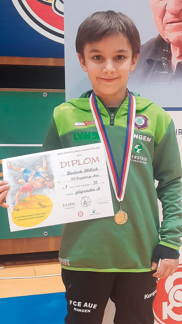 Derweil war Oldřich Bartsch am Samstag in Tschechien beim Františka-Maňáska-Gedenkturnier im freien Stil dabei. Insgesamt 180 Teilnehmer kamen dafür nach Hradec Králové (Königgrätz, circa 100 Kilometer nordöstlich von Prag). In seiner 31 Kilogramm-Klasse wurde nordisch gerungen. „Olli” vertrat den FC Erzgebirge sehr gut und gewann alle seine vier Kämpfe gegen Teilnehmer aus Polen, der Slowakei, Tschechien und der Ukraine. Es gelang ihm, alle Kämpfe mit technischer Überlegenheit zu gewinnen. Er gab keinen einzigen Wertungspunkt ab und wurde souverän Erster in der Gewichtsklasse bis 31 Kilogramm.