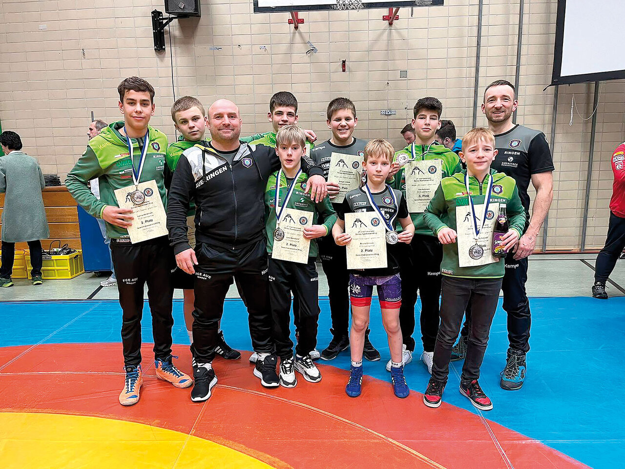 Unsere Jungs konnten sich gut in Szene setzen. Bruno Gliniorz kämpfte sich bei der Jugend C/D in der Gewichtsklasse bis 33 Kilogramm nach einer guten Turnierleistung in fünf Kämpfen bis auf den zweiten Platz. In der Jugend B/C errangen Theo Schreiner (bis 38 kg), Leon Mehlhorn (bis 39 kg) und Lenny Karwinski (bis 62 kg) nach jeweils vier Kämpfen ebenfalls die Silbermedaille. Ansgar Lindner konnte sogar nach drei starken Kämpfen in der Gewichtsklasse bis 80 Kilogramm die Goldmedaille holen. Bronze gab es für Vito Hohmann in der Gewichtsklasse bis 52 Kilogramm. Er konnte in vier Kämpfen zweimal gewinnen. Auf Platz vier landete Niels Schreyer in der Jugend A (bis 65 kg). Niels holte in fünf Kämpfen zwei souveräne Siege, musste jedoch auch drei knappe Niederlagen einstecken. Schwer war es für Erik Lindner (bis 74 kg) bei der Jugend A. Er belegte am Ende Rang fünf. Uwe Günther, Abteilungsleiter Ringen