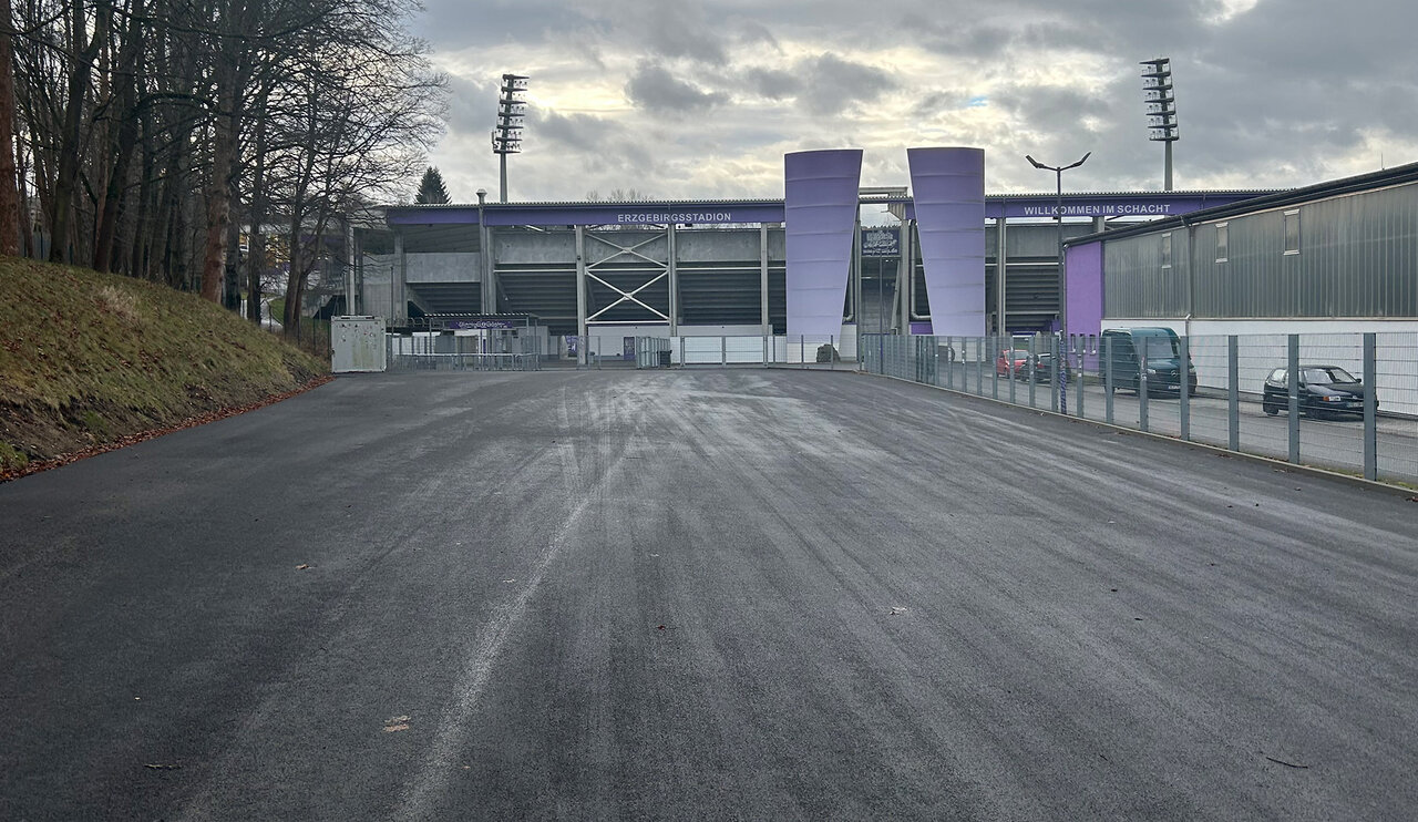 Der FC Erzgebirge Aue hat eine Baustelle erfolgreich geschlossen. Der Gästeparkplatz P8 wurde vor allem dank der Hilfe mehrerer Sponsoren und Unterstützer zu einem spiegelglatten Asphaltteppich. Die Auflage vom Landkreis ist somit erfüllt, die Gegebenheiten entsprechen höchstem Niveau.