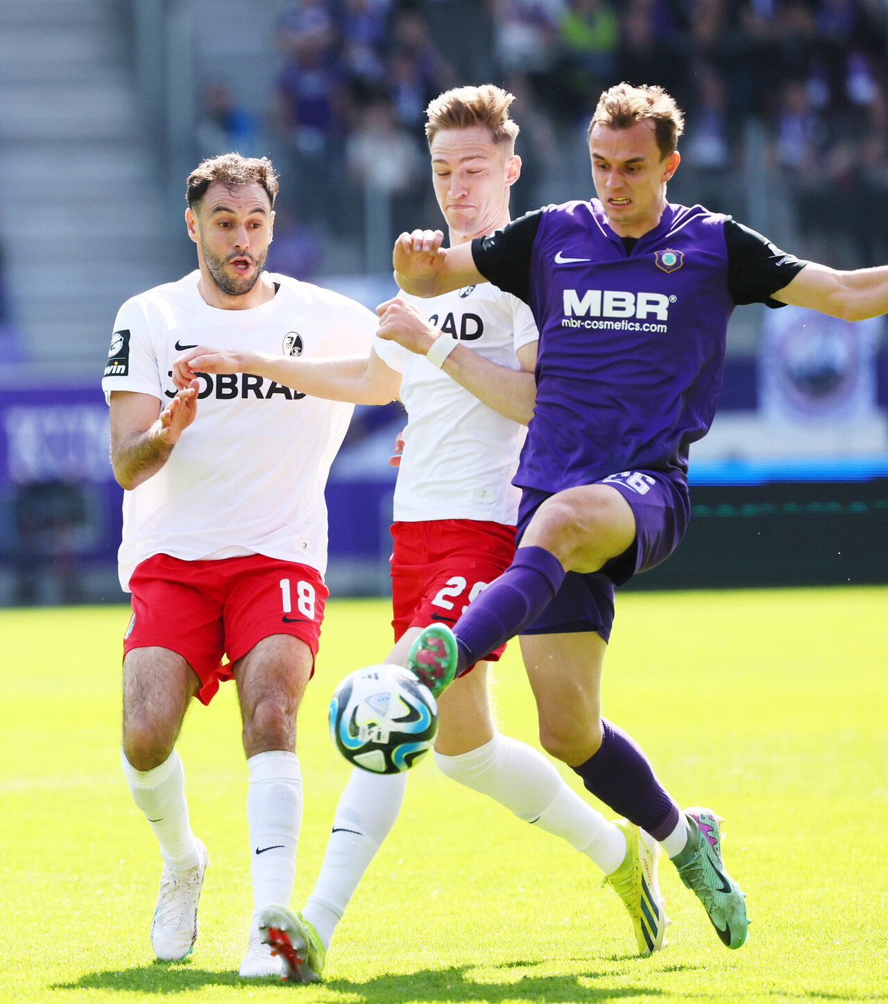 Beim Neustart 2023/24 war Kilian Jakob dann allerdings von Beginn an mittendrin, statt nur dabei. Zwar hat der 26-Jährige mit Linus Rosenlöcher einen starken Konkurrenten auf der Position links in der Viererkette. Dank seiner Laufstärke, guter Technik und gefährlicher Flanken kann er es aber auch links im Mittelfeld – und zeigte es. Er stellt sich stets in den Dienst des Teams, kein Weg ist ihm zu weit, er spielt für die Mannschaft und nicht für die Galerie. Ein Arbeiter, wie er im Buche steht. Der nach drei Vorlagen in der Liga nun gegen Freiburg auch seinen ersten Treffer erzielte. Eine satte Direktabnahme aus knapp 20 Metern, leicht abgefälscht und unhaltbar. Klar, dass sich Kilian Jakob über die Glückwünsche seiner Kollegen freute. Er hat sie sich verdient. Mit Kontinuität, Fleiß und nimmermüdem Einsatz.